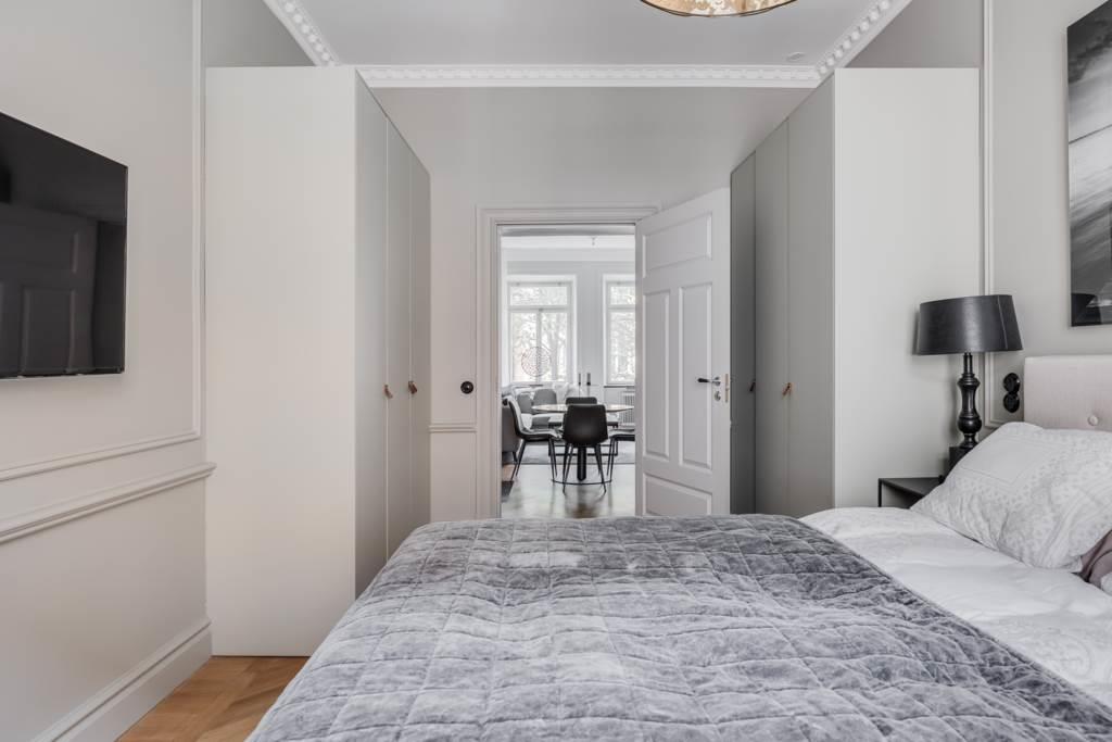 Lägenheten är stilren och luftig med stora sociala sällskapsytor och en generös takhöjd. Den erbjuder gott om platsbyggd förvaring, exklusiva materialval och många fina originaldetaljer. Fullt utrustat kök med matplats i halvöppen planlösning som ansluter till den stora sällskapsdelen med dubbelfönster i fil. Det luftiga sovrummet med dubbla fönster erbjuder många vackra detaljer, platsbyggda garderober och utrymme för arbetshörna. Sekelskiftesdetaljerna är på plats såsom härlig takhöjd, vackra snickerier, fiskbensparkett, stora fönsterpartier med djupa nischer.