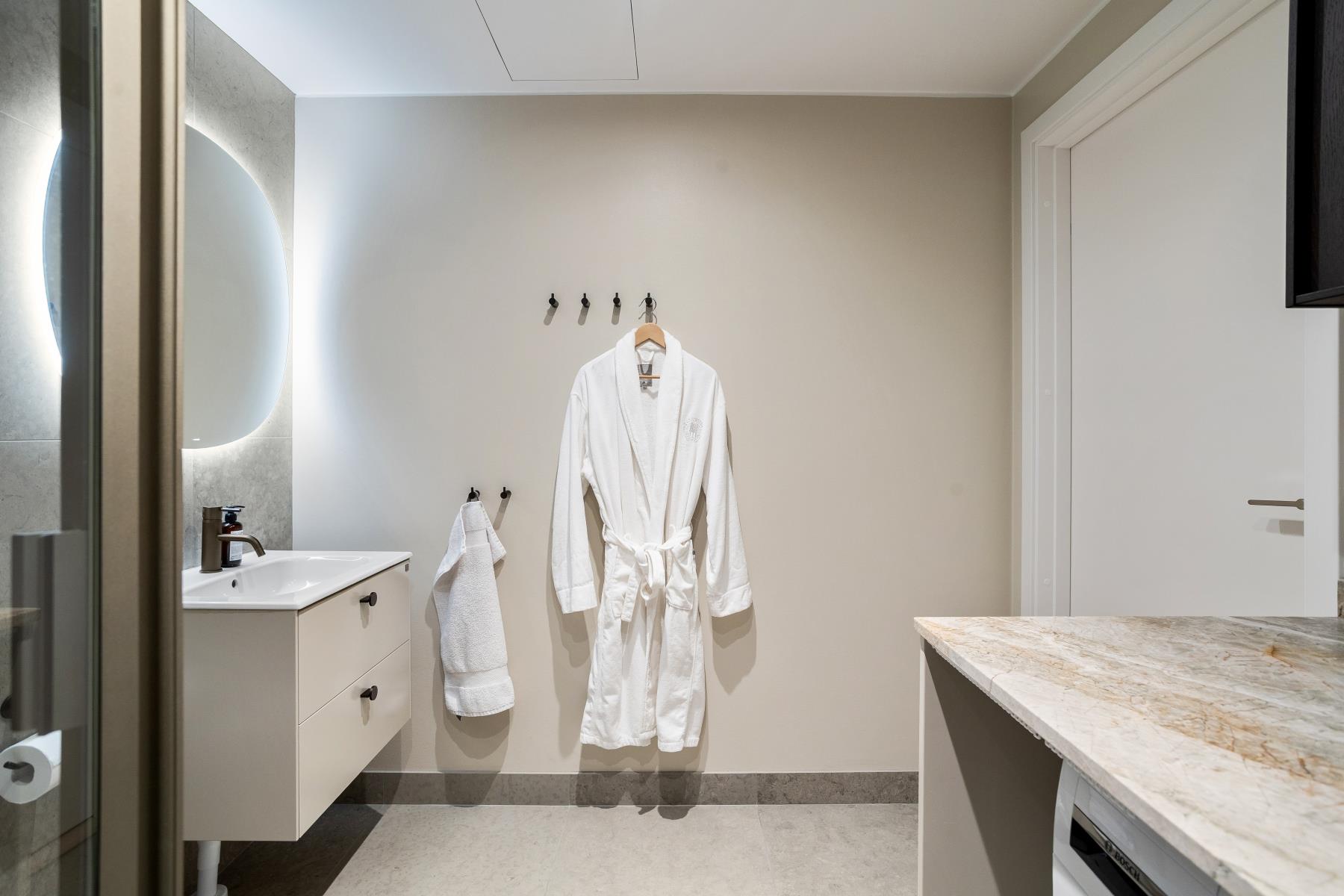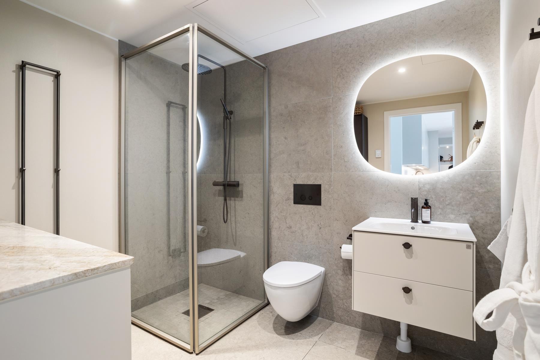 Badrummet håller samma höga standard som resten av bostaden och är utrustat med vitvaror från Bosch. Blandare, handdukstork och dusch kommer från Tapwell och påkostat kakel samt klinker i en enhetlig design skapar en lyxig känsla. Här finns även egen tvättmaskin och torktumlare som underlättar i vardagen. Dessutom finns en separat gäst-WC – något som gör bostaden extra funktionell för den större familjen eller för dig som gillar att bjuda hem vänner.