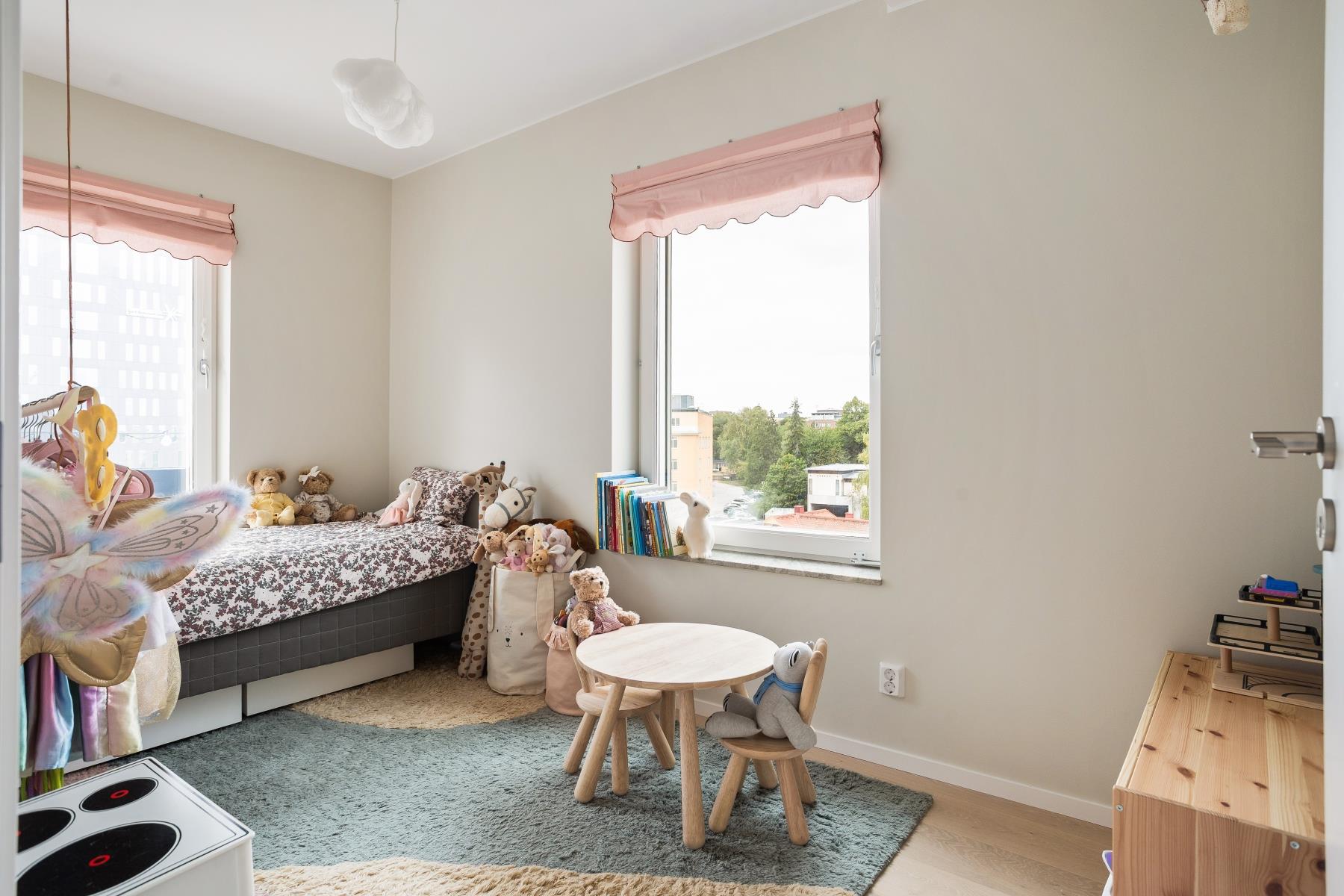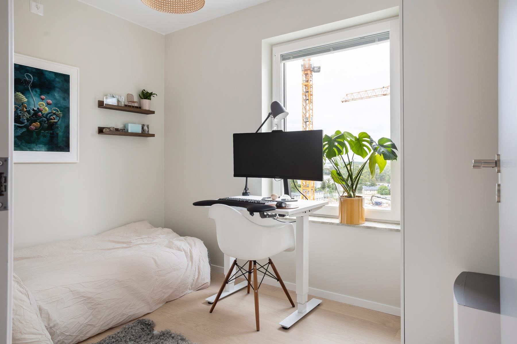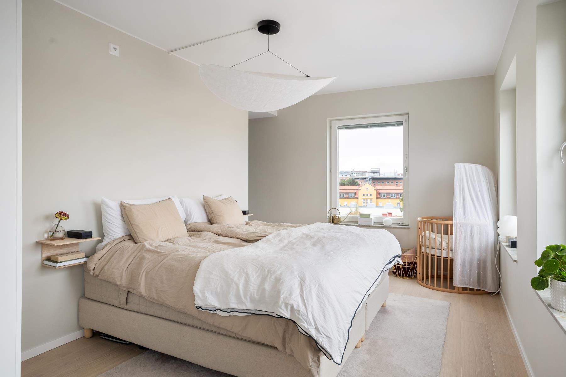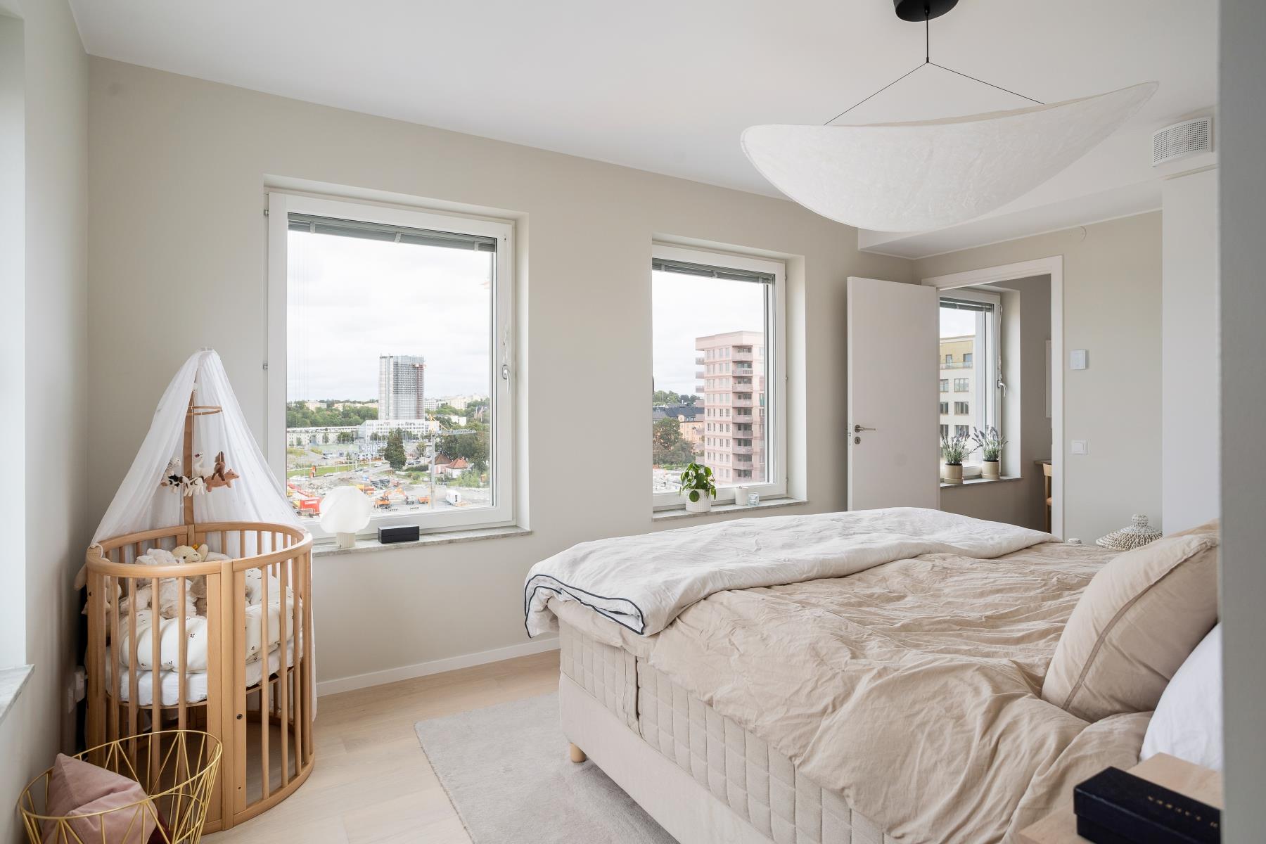 Bostaden erbjuder tre välplanerade sovrum, där master bedroom har ett hörnläge med fönster i två väderstreck, vilket ger en härlig rymd. Här finns även en praktisk klädkammare som tack vare sitt fönster också kan användas som hemmakontor.