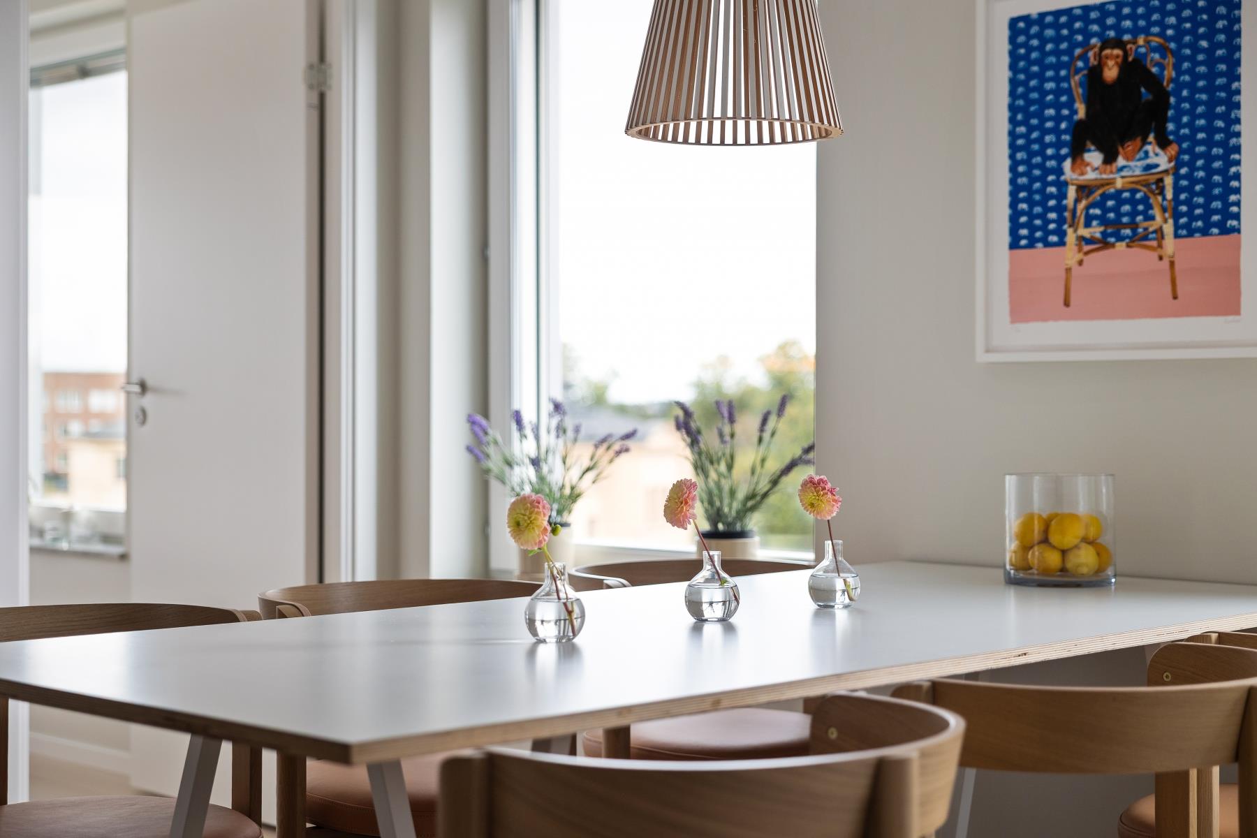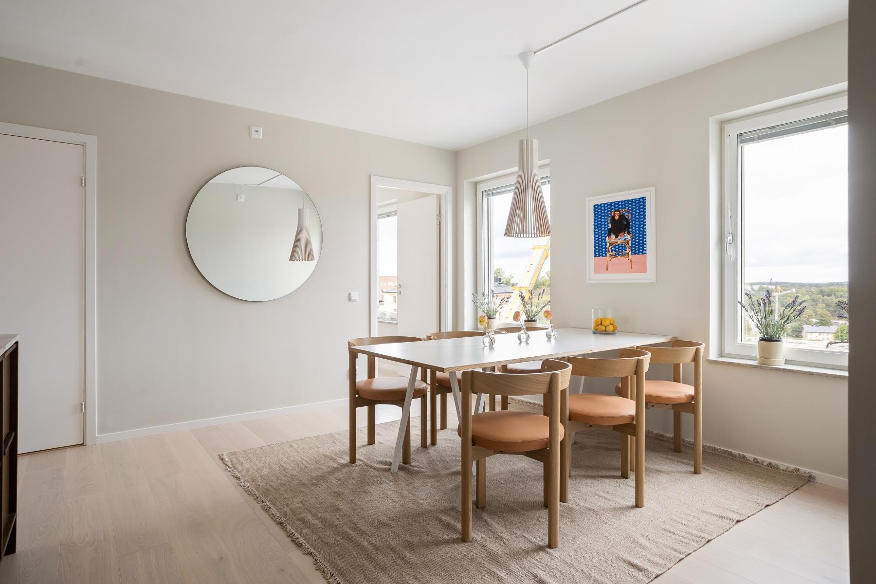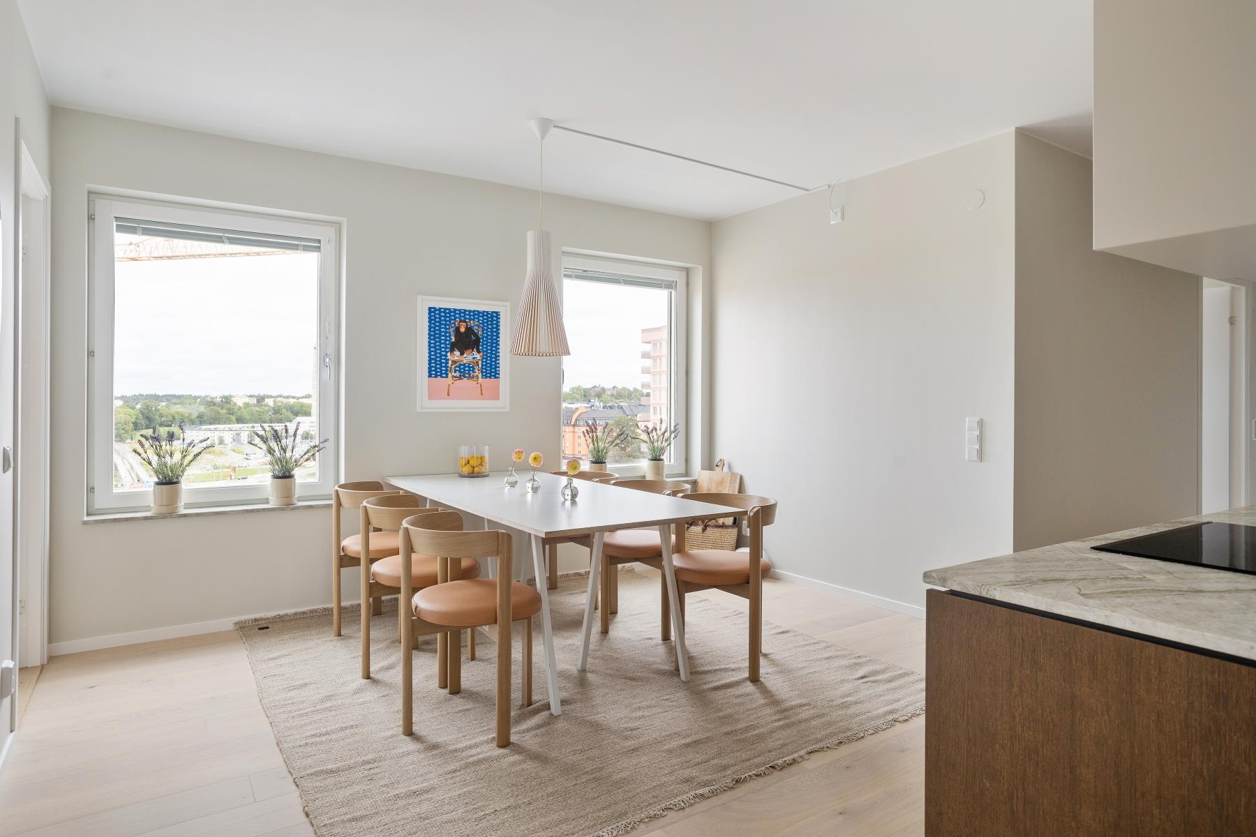Lägenheten präglas av stilrena materialval, genomgående vattenburen golvvärme och en harmonisk färgpalett som skapar en varm och välkomnande känsla. Tack vare det höga läget i huset och fönster i tre väderstreck flödar ljuset in i alla rum.