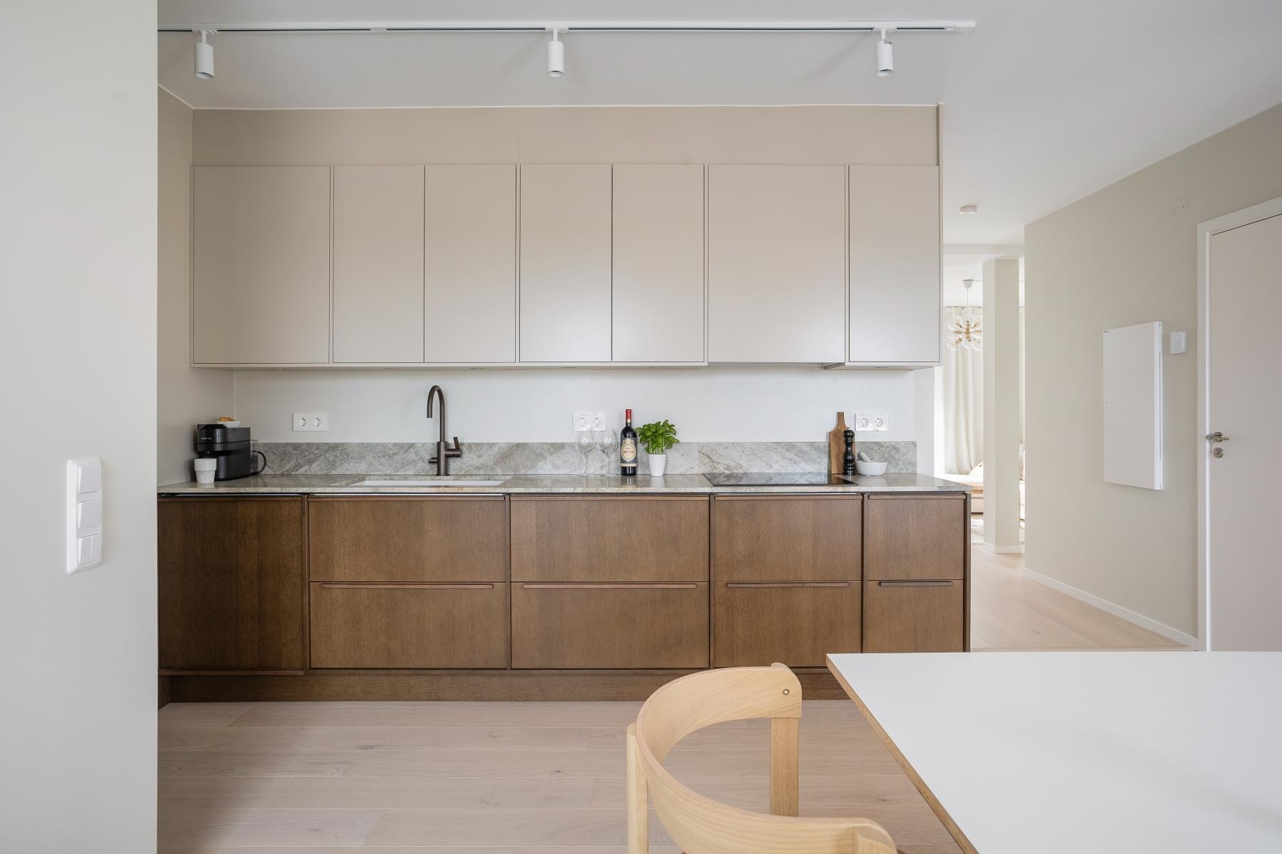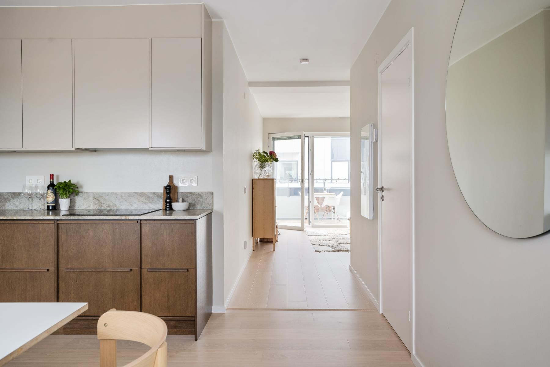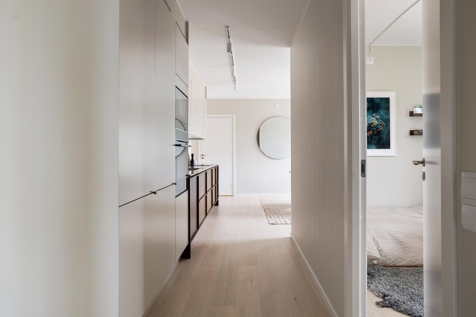 Lägenheten präglas av stilrena materialval, genomgående vattenburen golvvärme och en harmonisk färgpalett som skapar en varm och välkomnande känsla. Tack vare det höga läget i huset och fönster i tre väderstreck flödar ljuset in i alla rum.