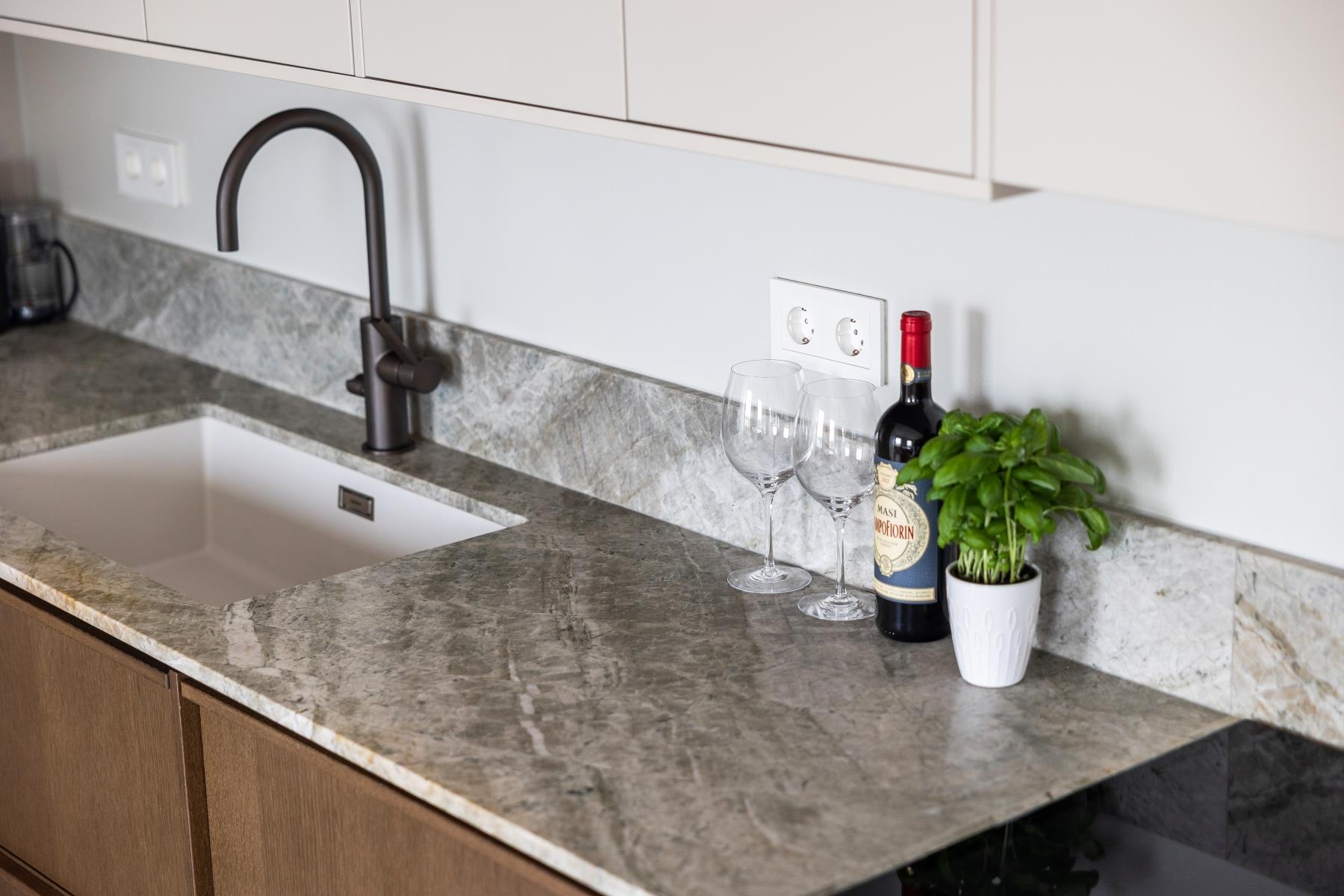 Köket kommer från Marbodal och håller genomgående hög standard. Här möts varma toner av mörkbetsad ek och ljusa sandfärgade luckor, kombinerat med en bänkskiva och stänkskydd i natursten. Köket är fullt utrustat med vitvaror från Siemens, inklusive inbyggd mikro och ugn i högskåp samt integrerade vitvaror för en enhetlig och elegant känsla. Intill köket ryms en generös matplats med plats för stora middagar och sociala sammankomster.