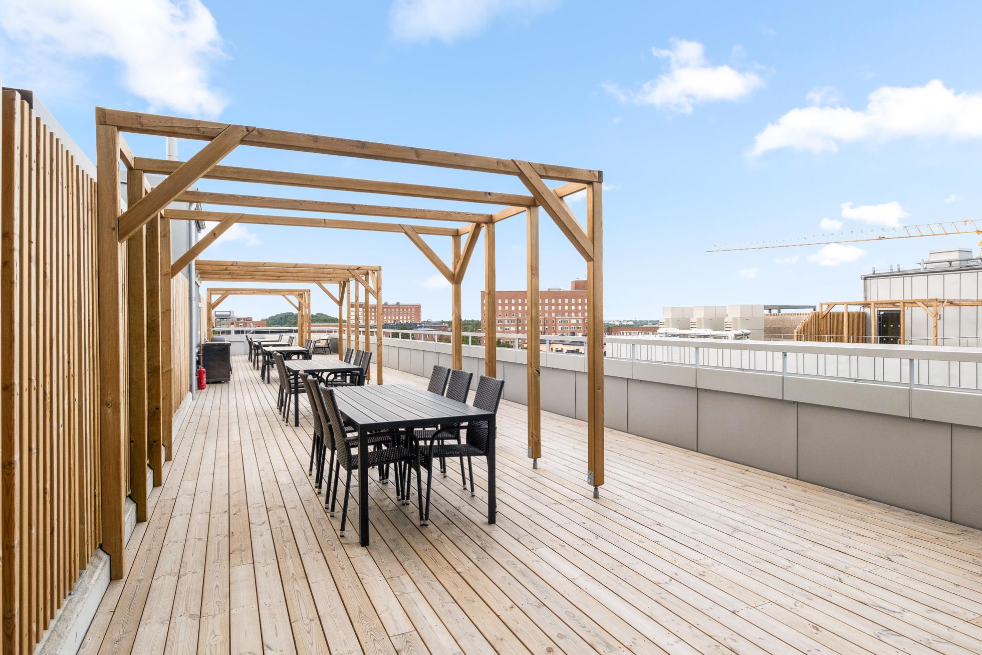 Som boende i föreningen har du dessutom tillgång till en stor gemensam takterrass med härlig utsikt. Terrassen är utrustad med grill och loungemöbler (ingen vattenanslutning), perfekt för sociala tillställningar och avkoppling. På taket finns även ett gemensamt gym, vilket gör det enkelt att hålla sig aktiv utan att lämna huset.