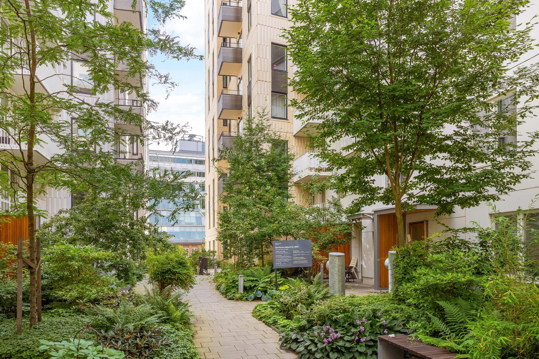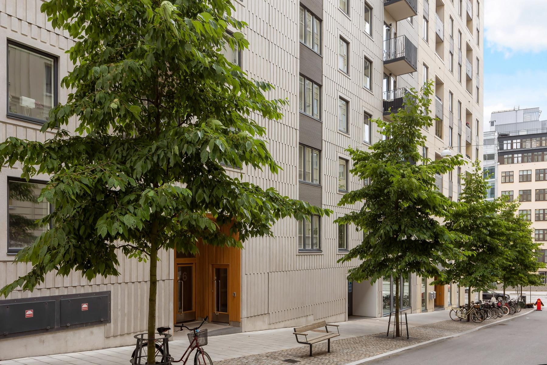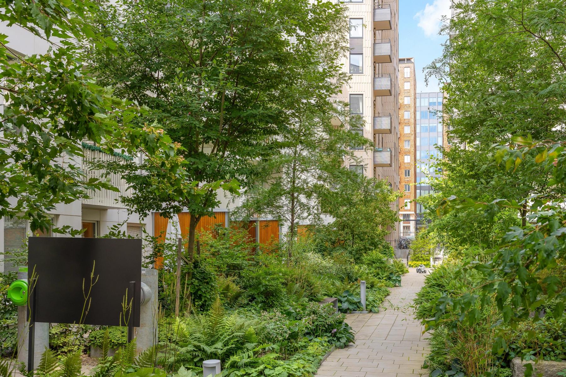 Lägenheten är belägen på en lugn gata med all typ av service runt hörnet såsom flera förskolor, skolor, livsmedelsaffärer, gym och vårdcentral. Det finns mysiga cafeér, populära restauranger och exklusiva takbarer på bara några minuters gångavstånd. Som en kontrast till gatulivet finns i andra änden av kvarteret Norra Stationsparken. Den nya, halvkilometer långa parken kommer erbjuda grönska, promenadstråk, bersåer och vattenspeglar alldeles inpå knuten. Den blir också en grön passage hela vägen till Vasastadsbornas klassiska gröna lugna Hagaparken. Dessutom går det snabbt och lätt att ta sig från Hagastaden till Karlberg, där det finns både slottspark och strandpromenad.