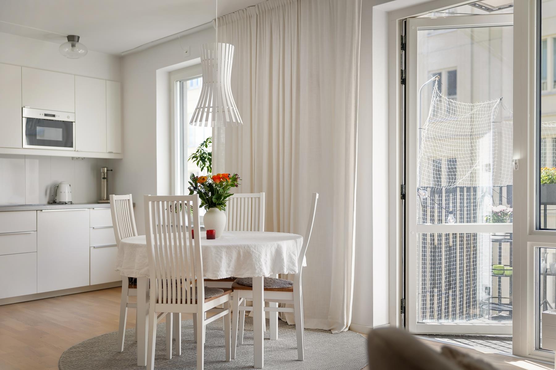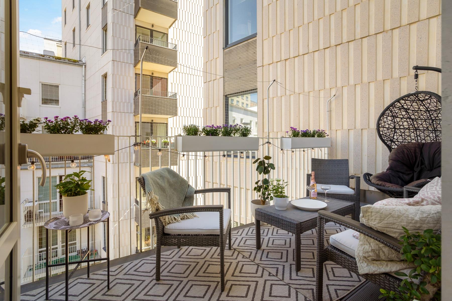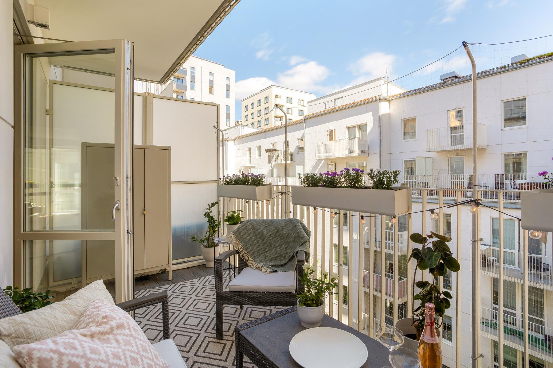 Lägenheten förlängs med en underbar terrass som blir en naturlig mötesplats under sommarhalvåret. Här finns gott om plats för valfritt önskat möblemang