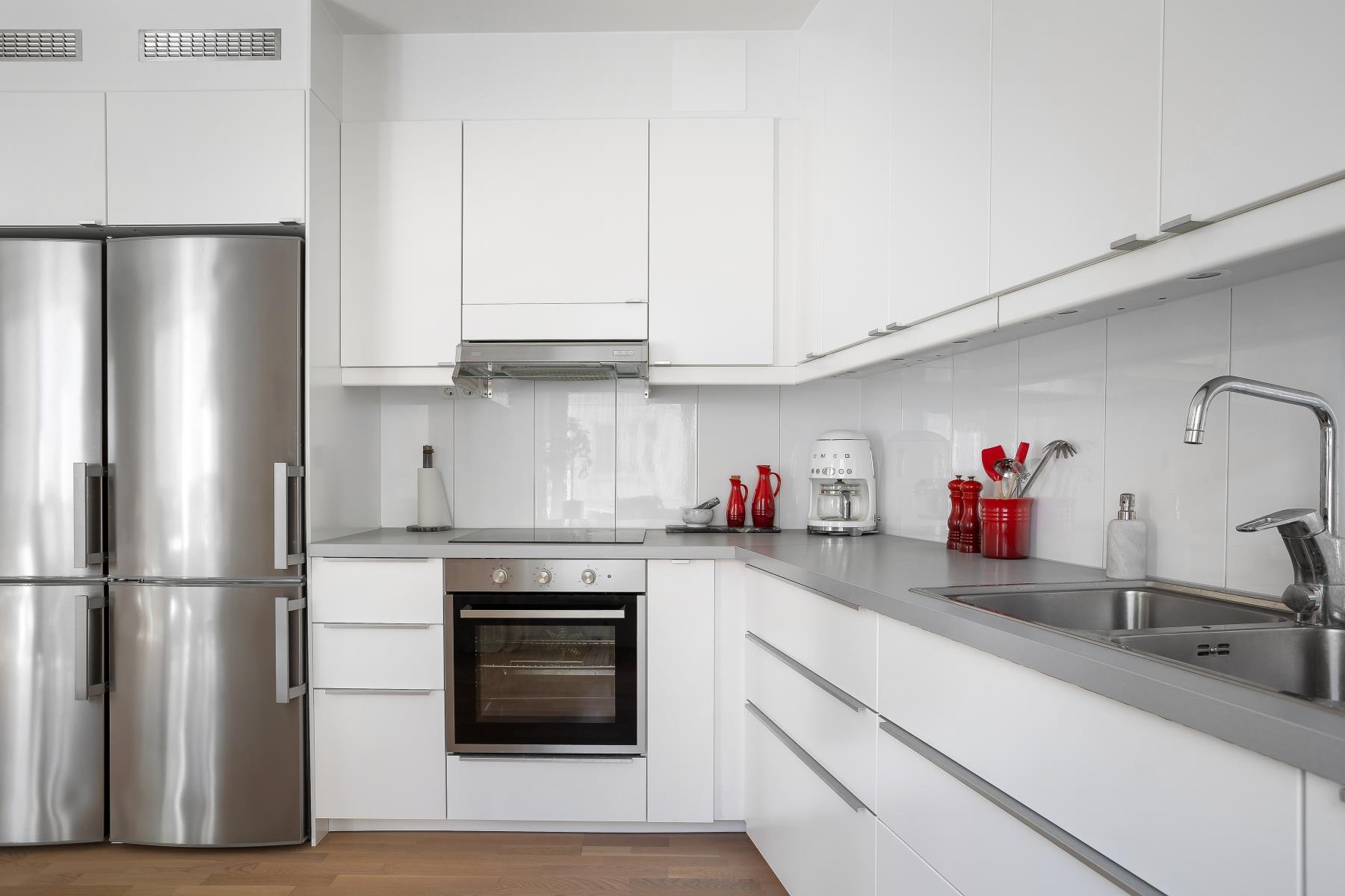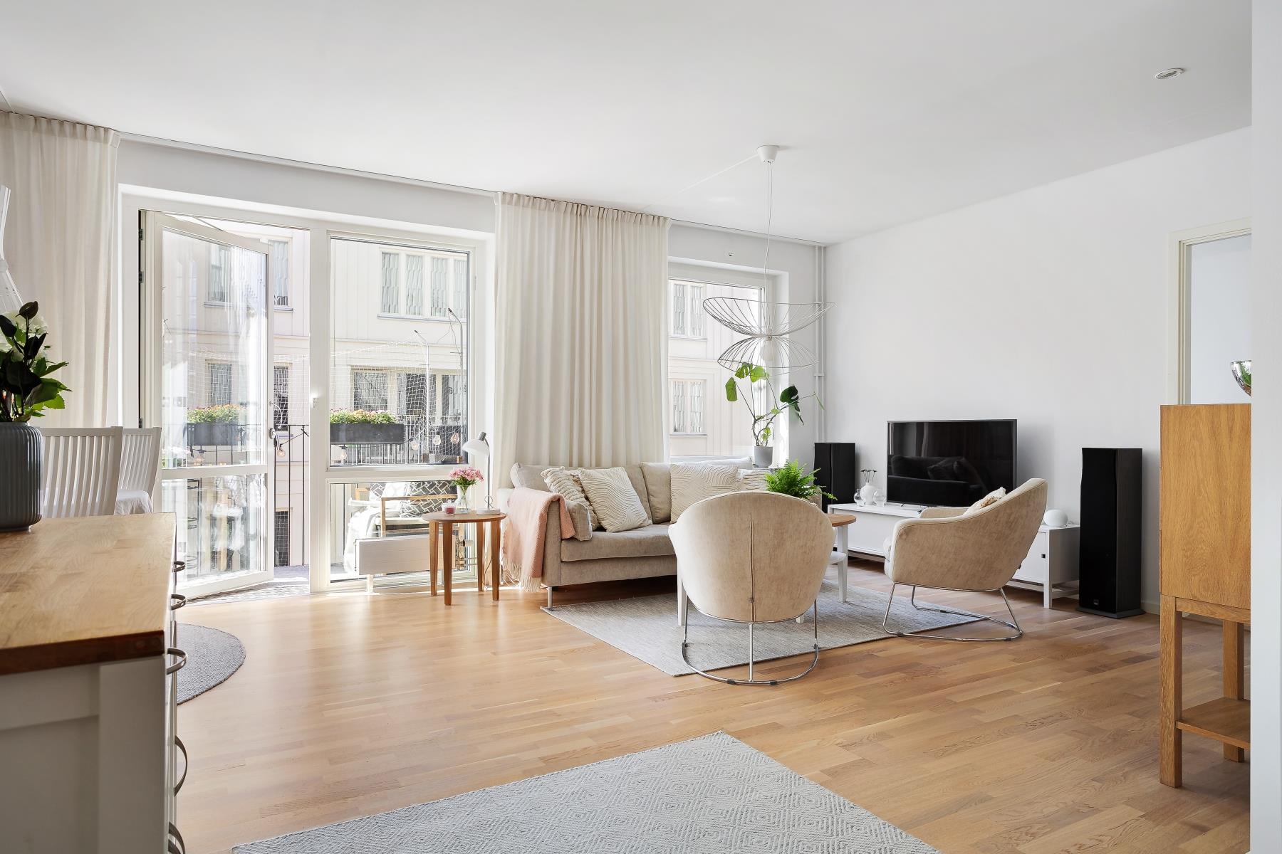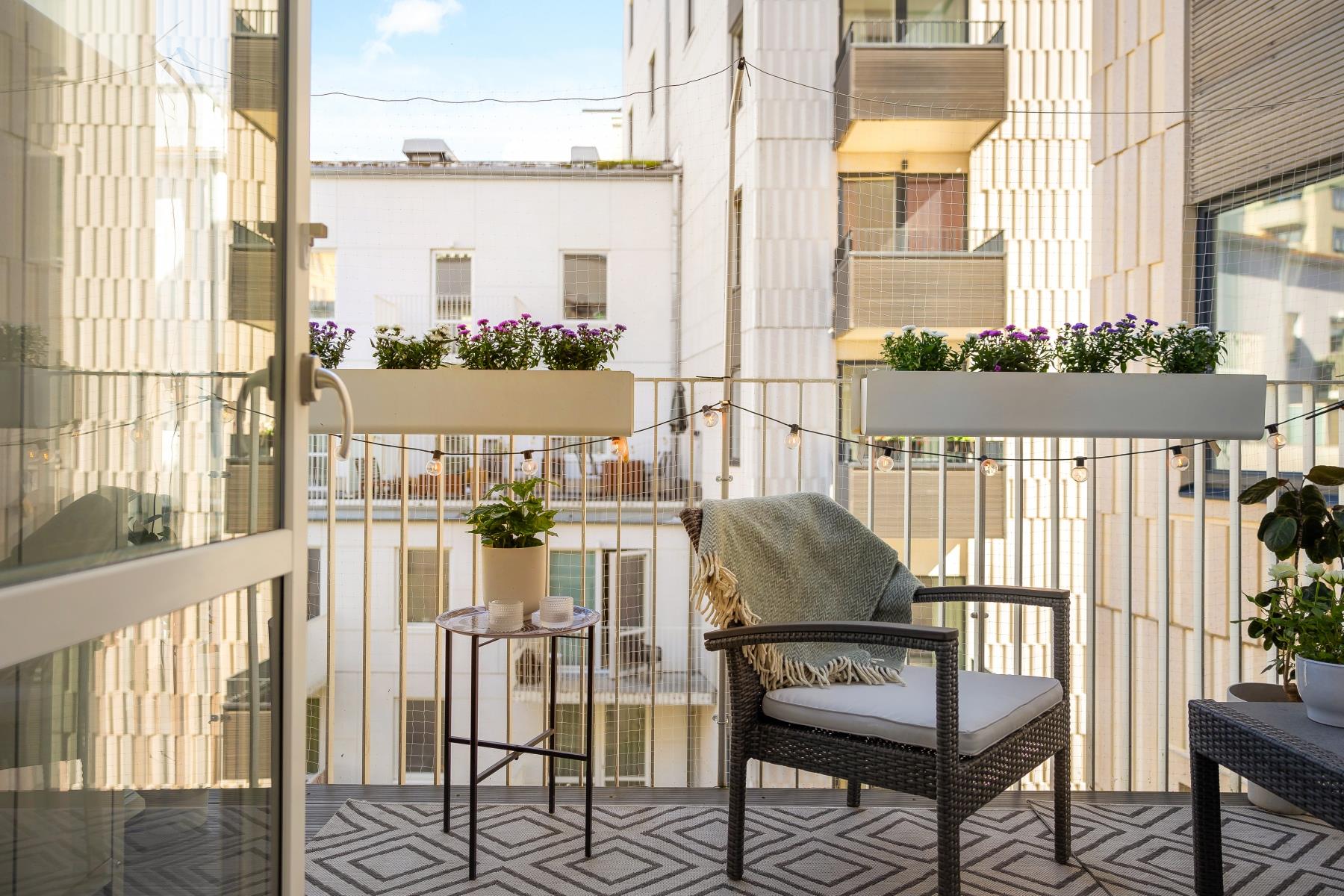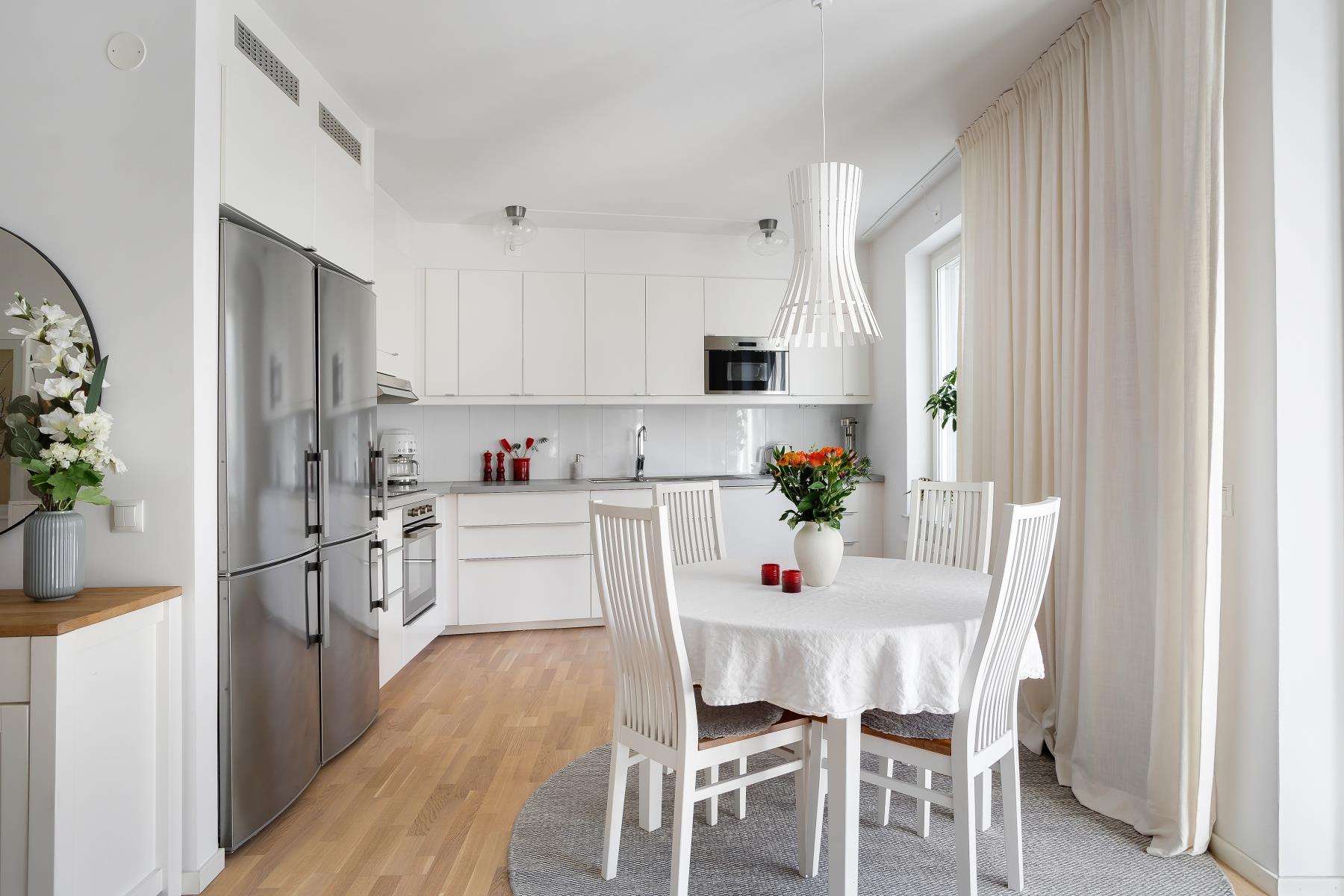 Lägenheten förlängs med en underbar terrass som blir en naturlig mötesplats under sommarhalvåret. Här finns gott om plats för valfritt önskat möblemang