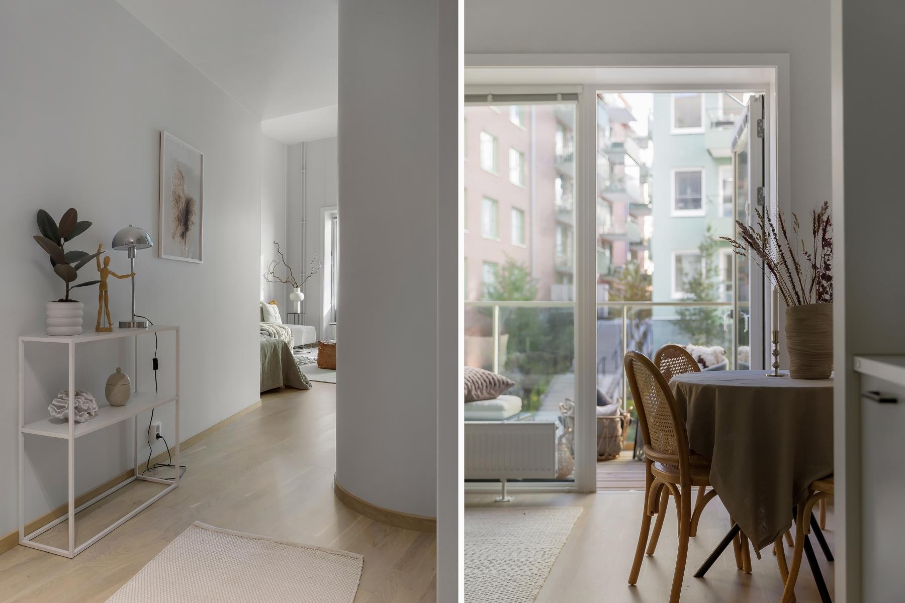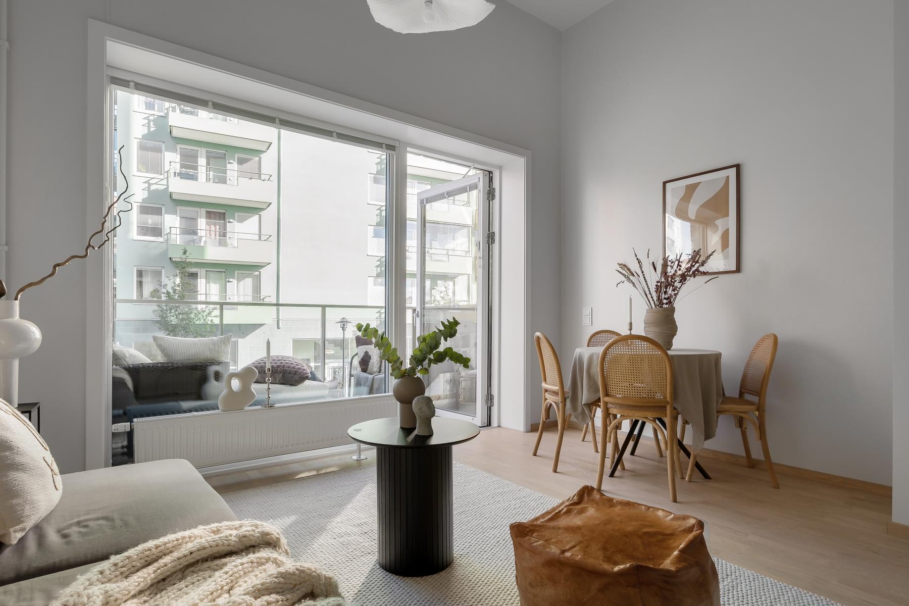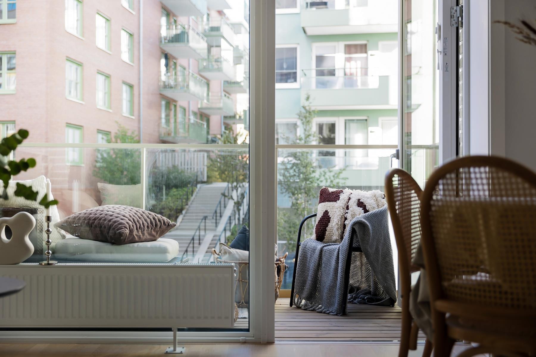 Vidare erbjuder bostaden ett fint ljusinsläpp från stora fönsterpartier, en magisk takhöjd (3,6 m), fullt utrustat kök, helkaklat badrum och en stor balkong.