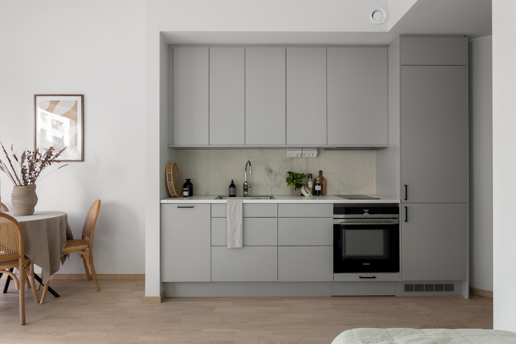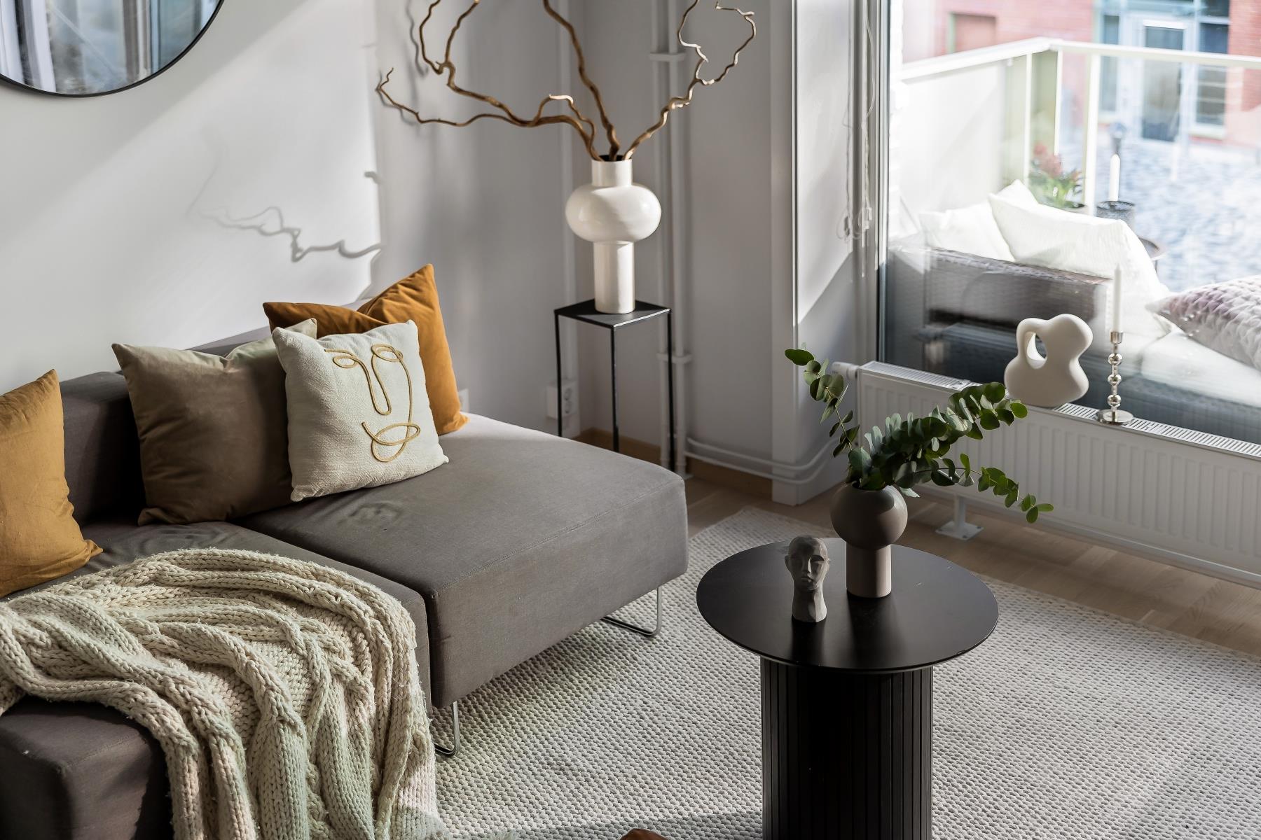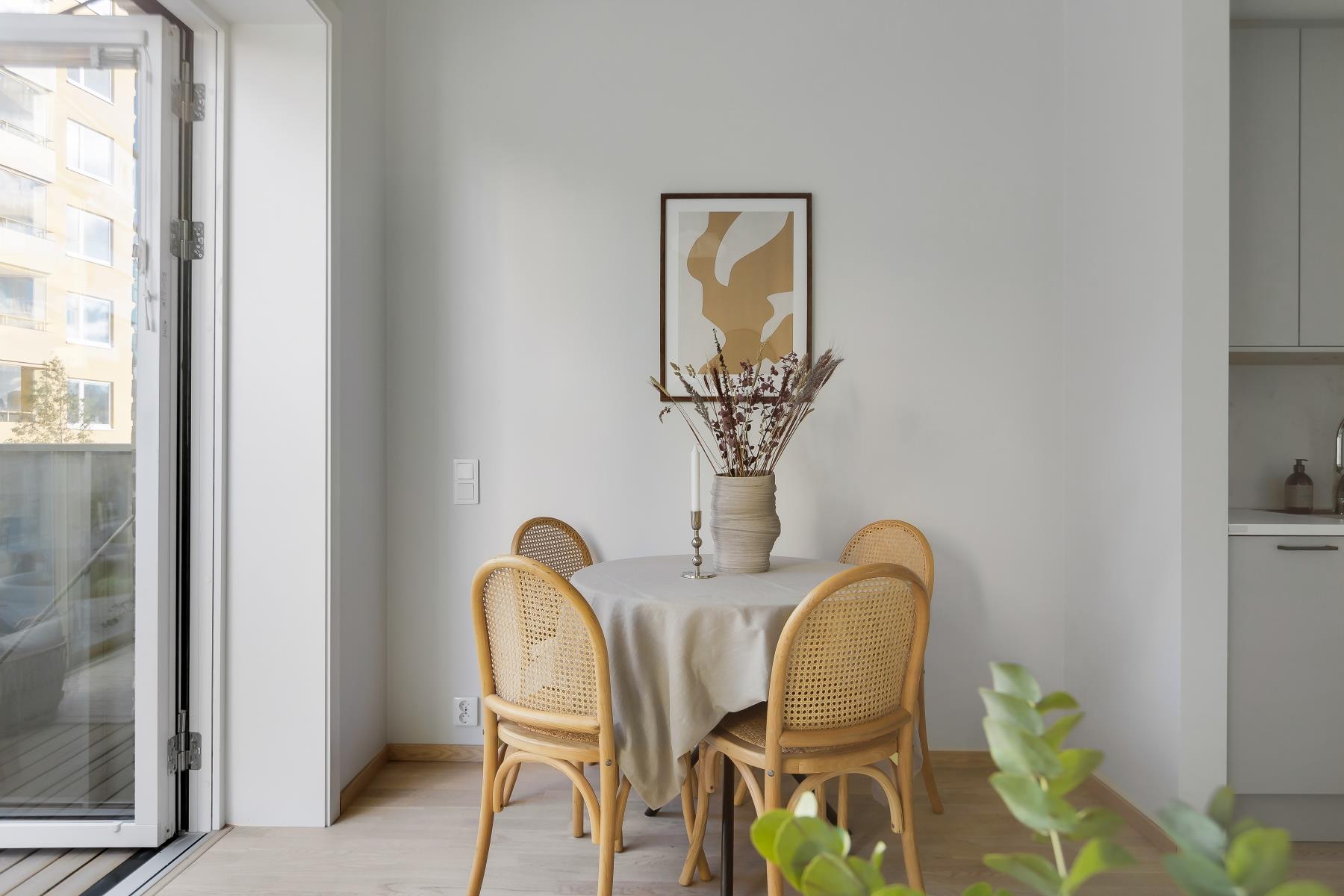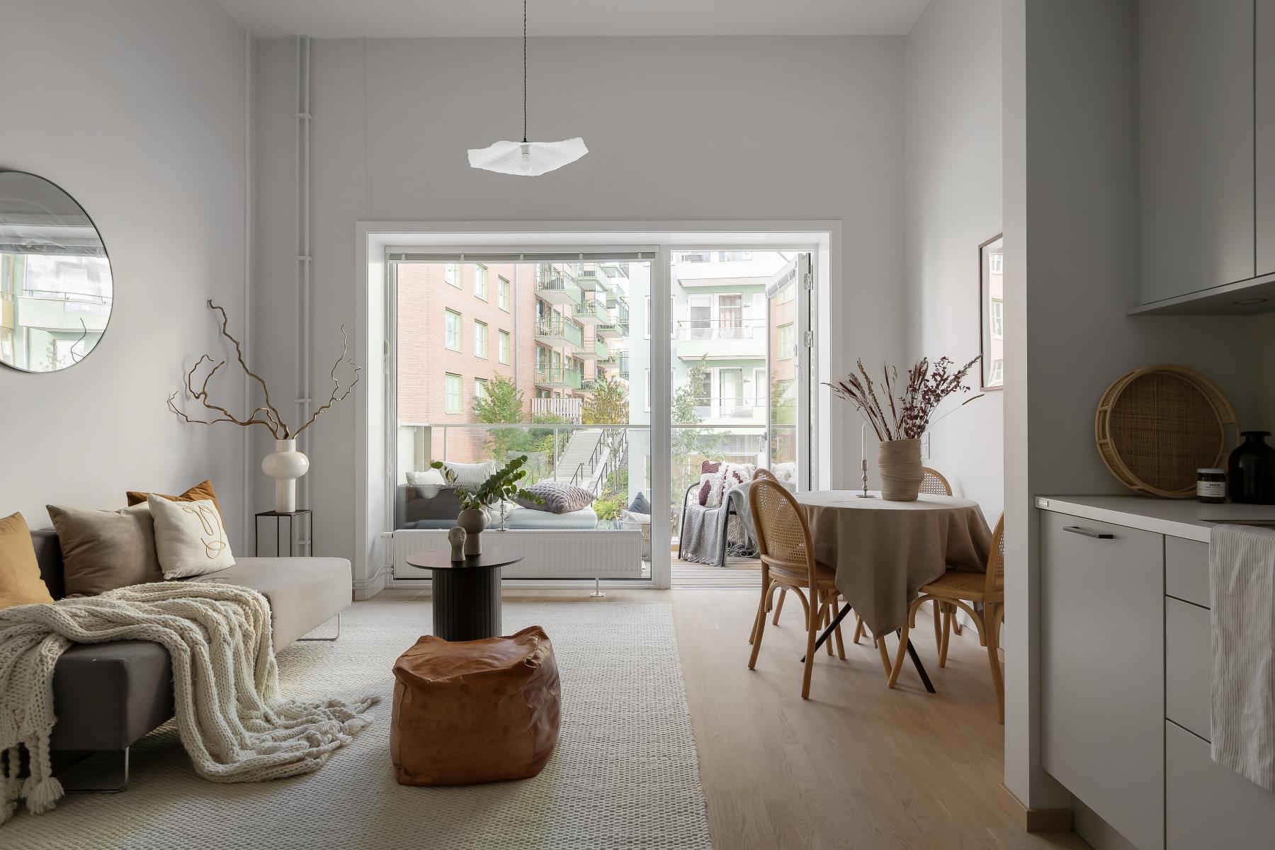 Vidare erbjuder bostaden ett fint ljusinsläpp från stora fönsterpartier, en magisk takhöjd (3,6 m), fullt utrustat kök, helkaklat badrum och en stor balkong.