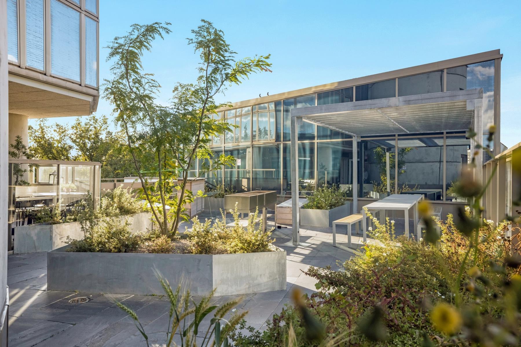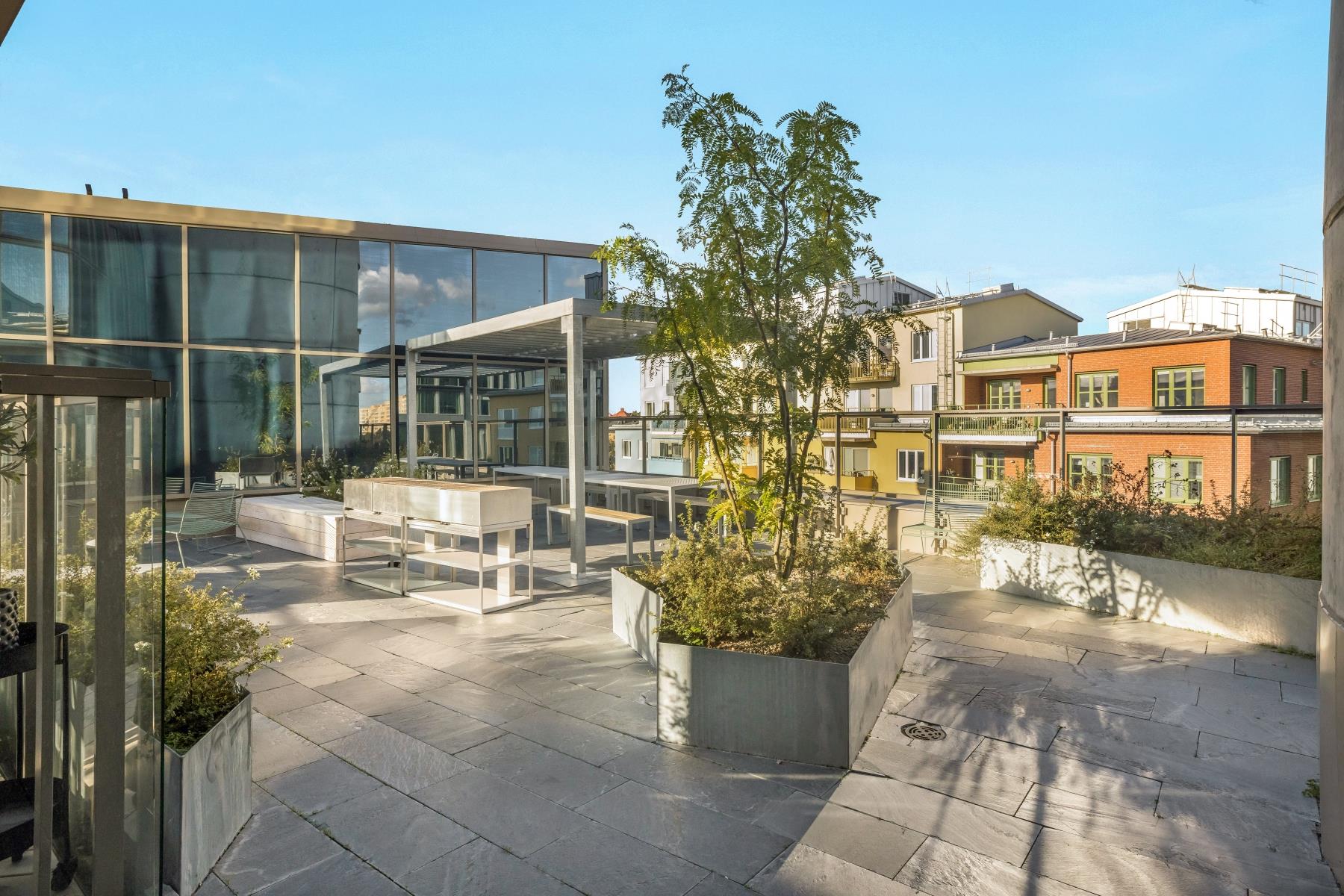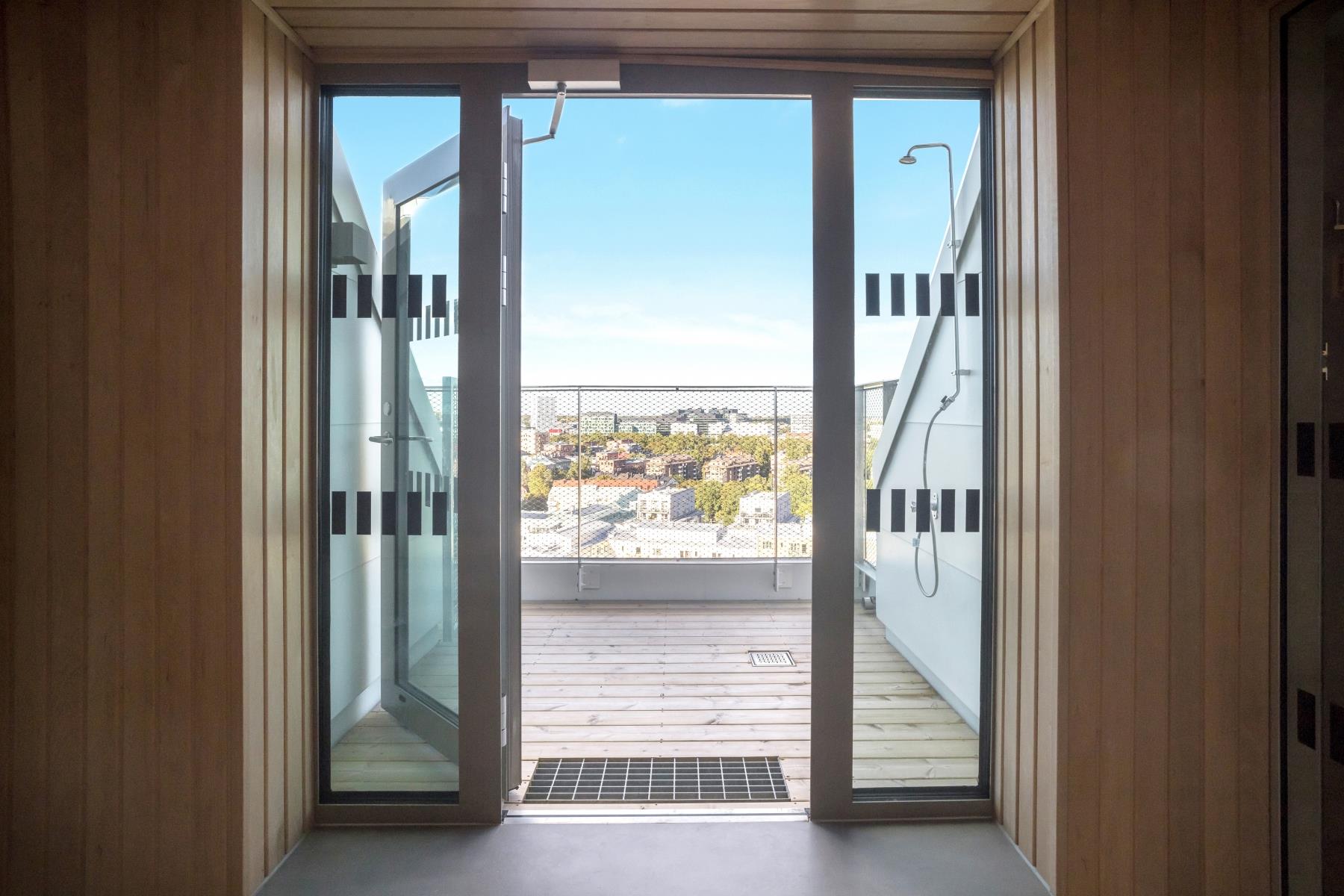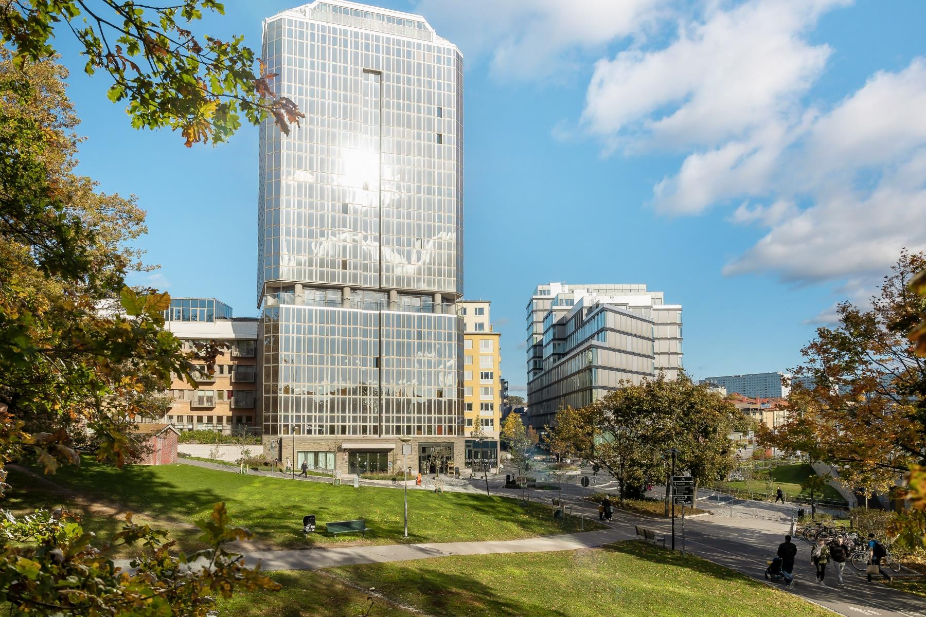 Plan 2 (cykelförråd, barnvagnsrum, föreningslokal, övernattningslägenheter, foaje, lounge, biosalong), Plan 7 (takterrass) Plan 17 (Wellnesslokal)