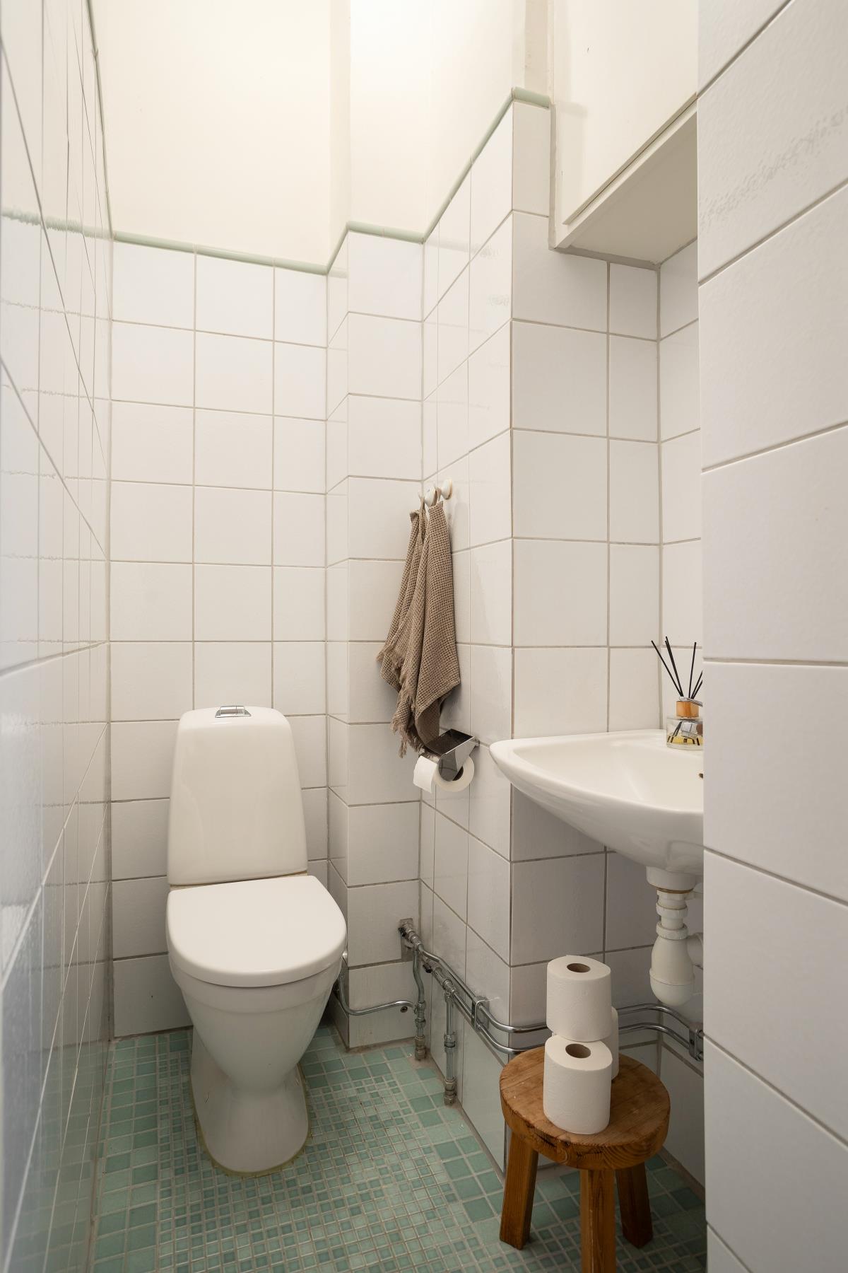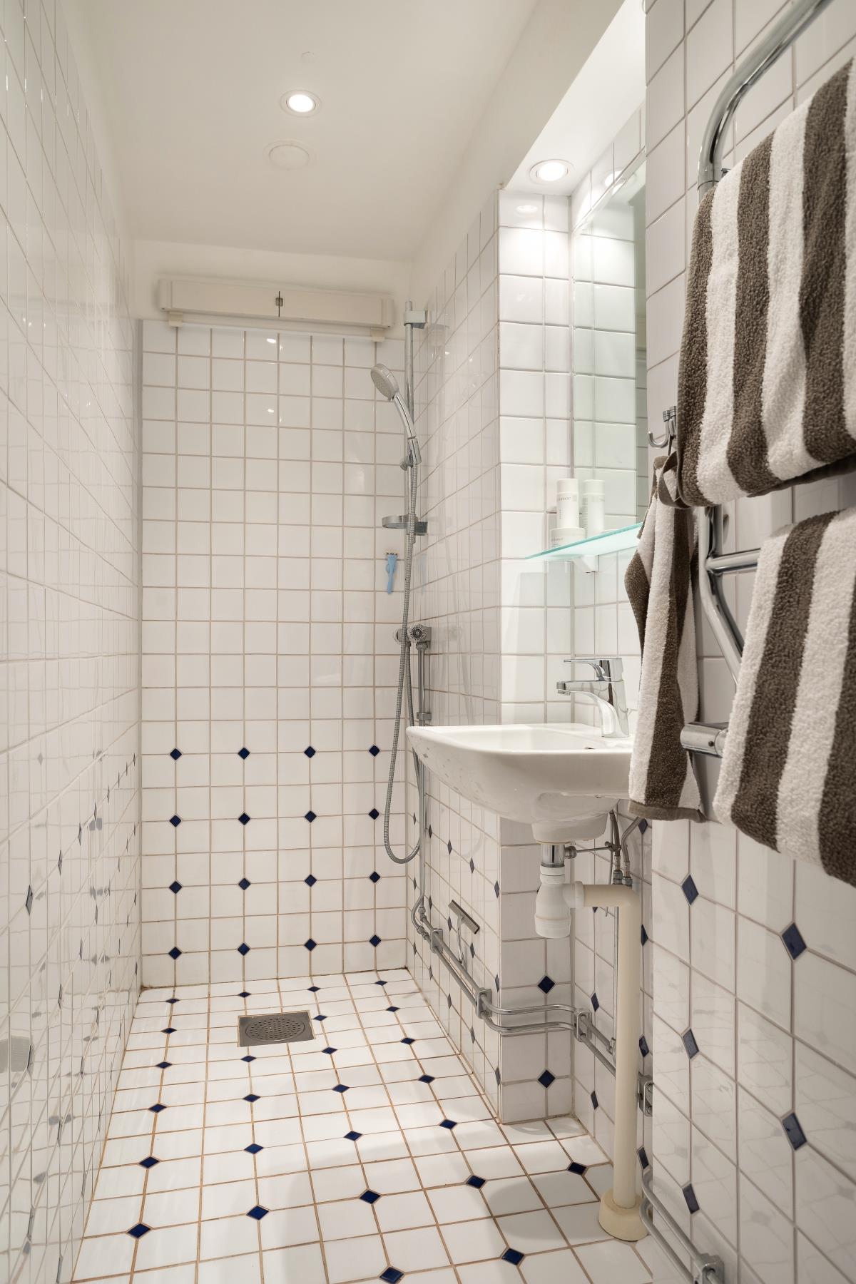 WC samt duschrum är båda helkaklade i ljusa färger.