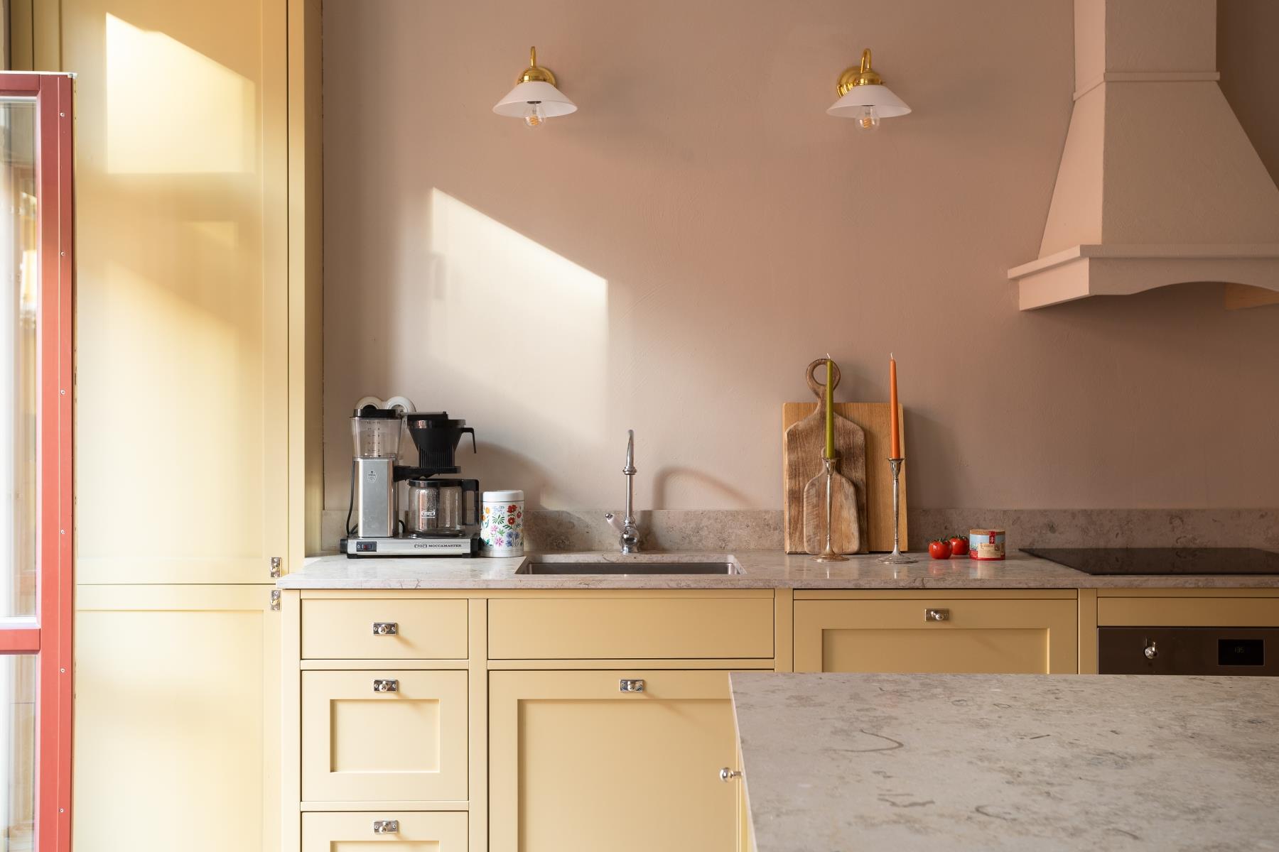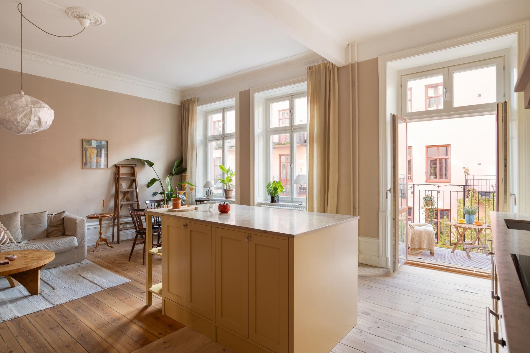 Det platsbyggda köket i sobert gulbeige kulör är hjärtat i hemmet, öppet mot vardagsrummet och perfekt för både vardag och umgänge. Härifrån når du också balkongen med soligt läge mot den charmiga innergården som blir en naturlig förlängning av sällskapsdelen under årets varmare månader.