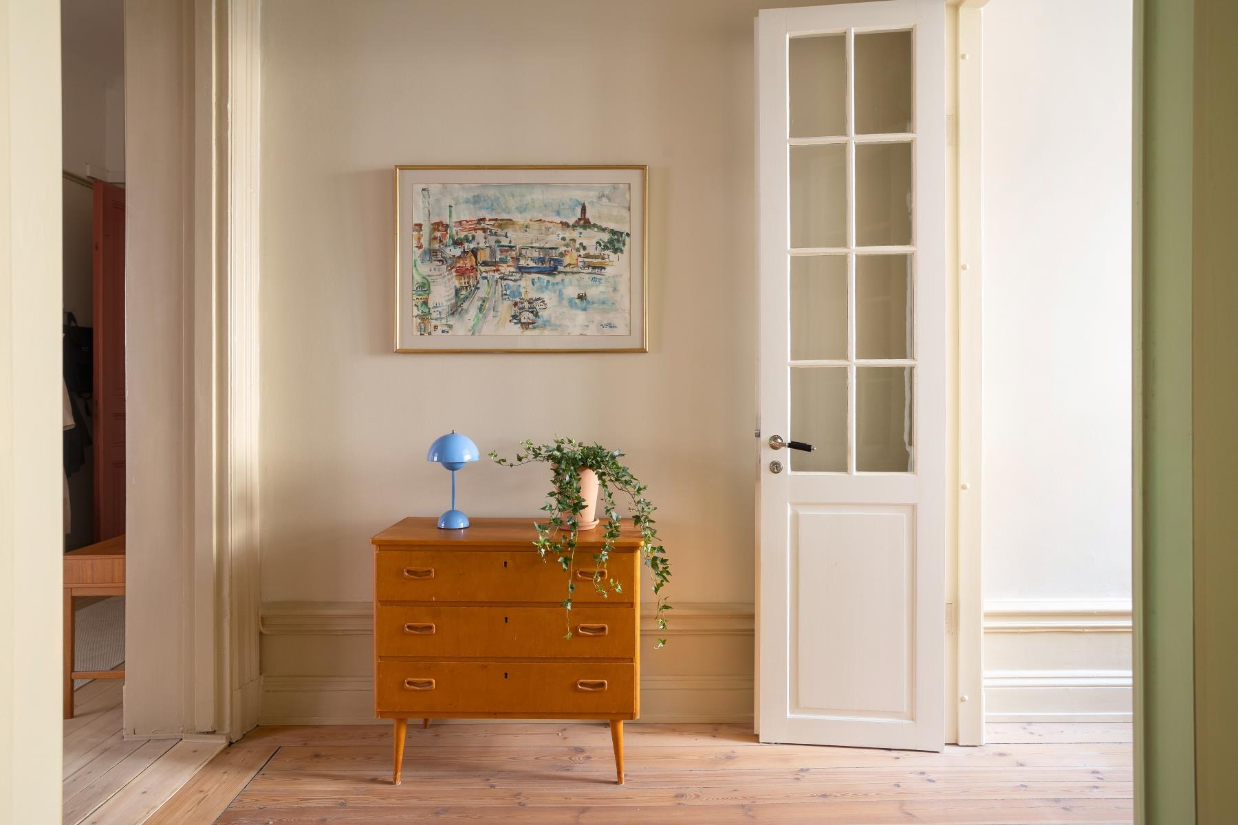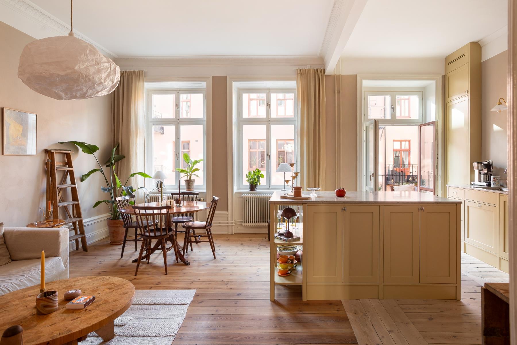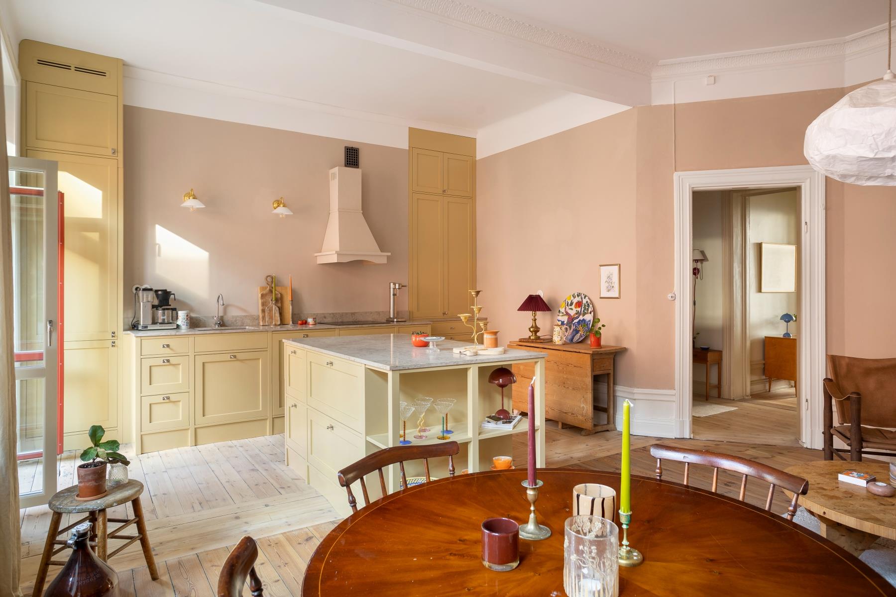 Lägenheten har varsamt renoverats med känsla för material, färg och proportioner.