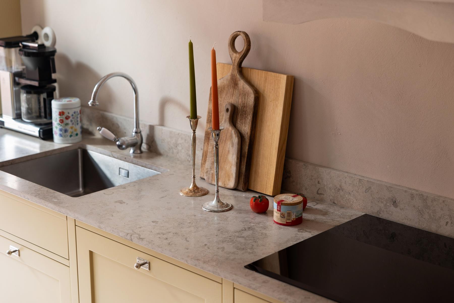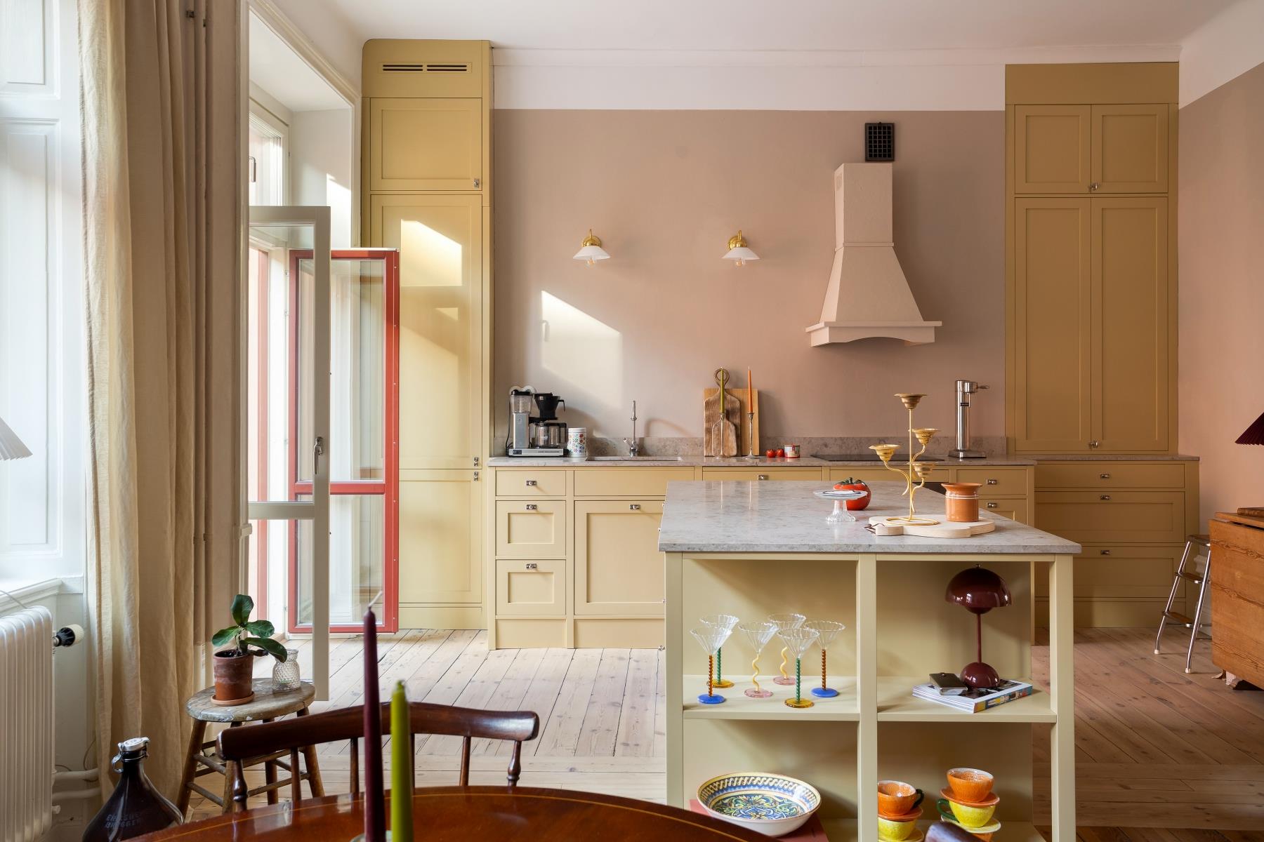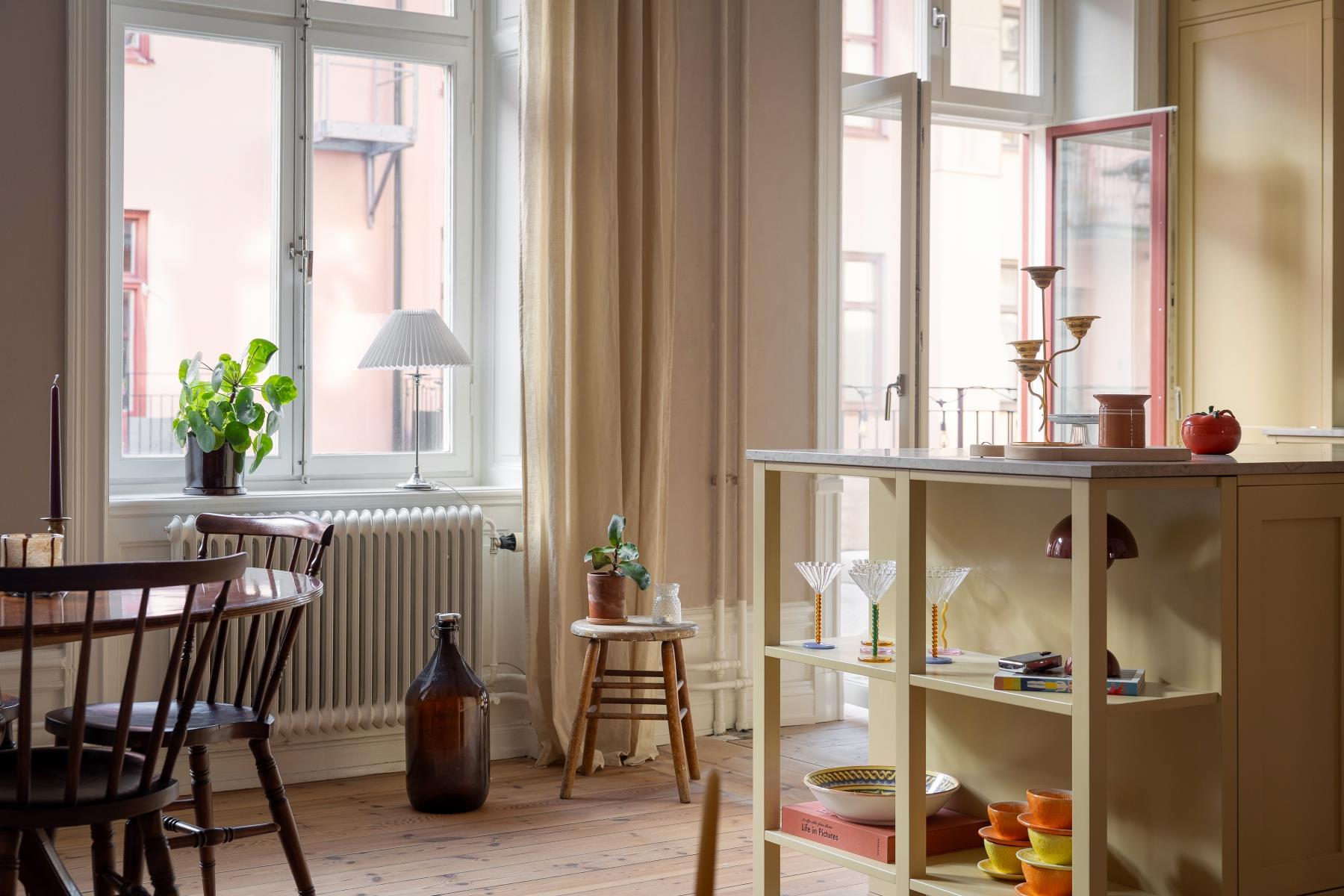 Lägenheten har varsamt renoverats med känsla för material, färg och proportioner.