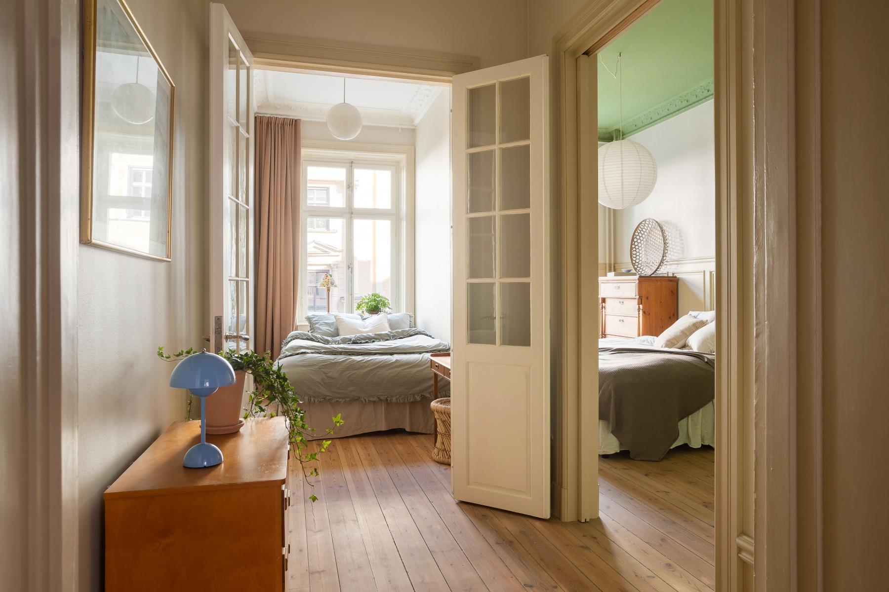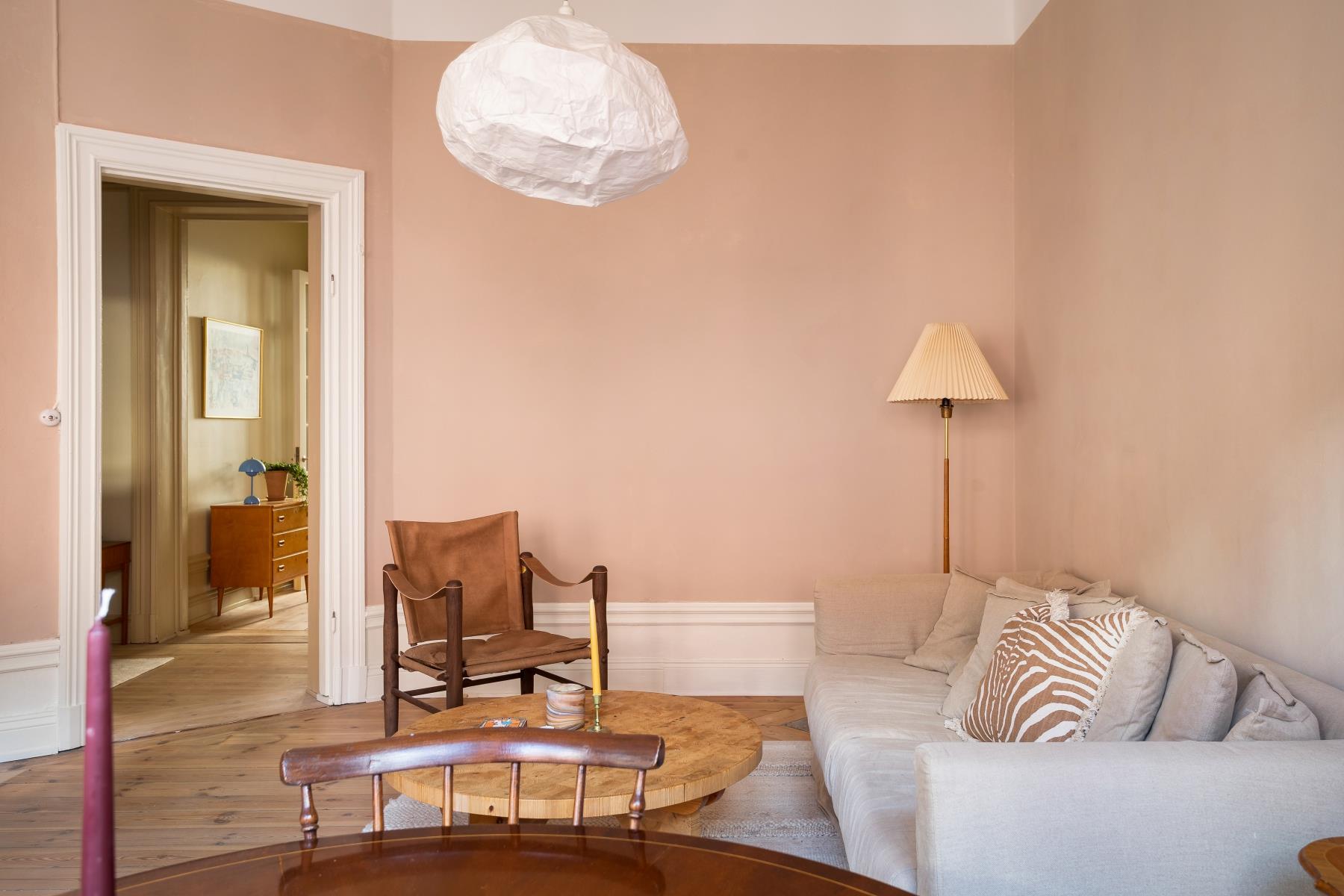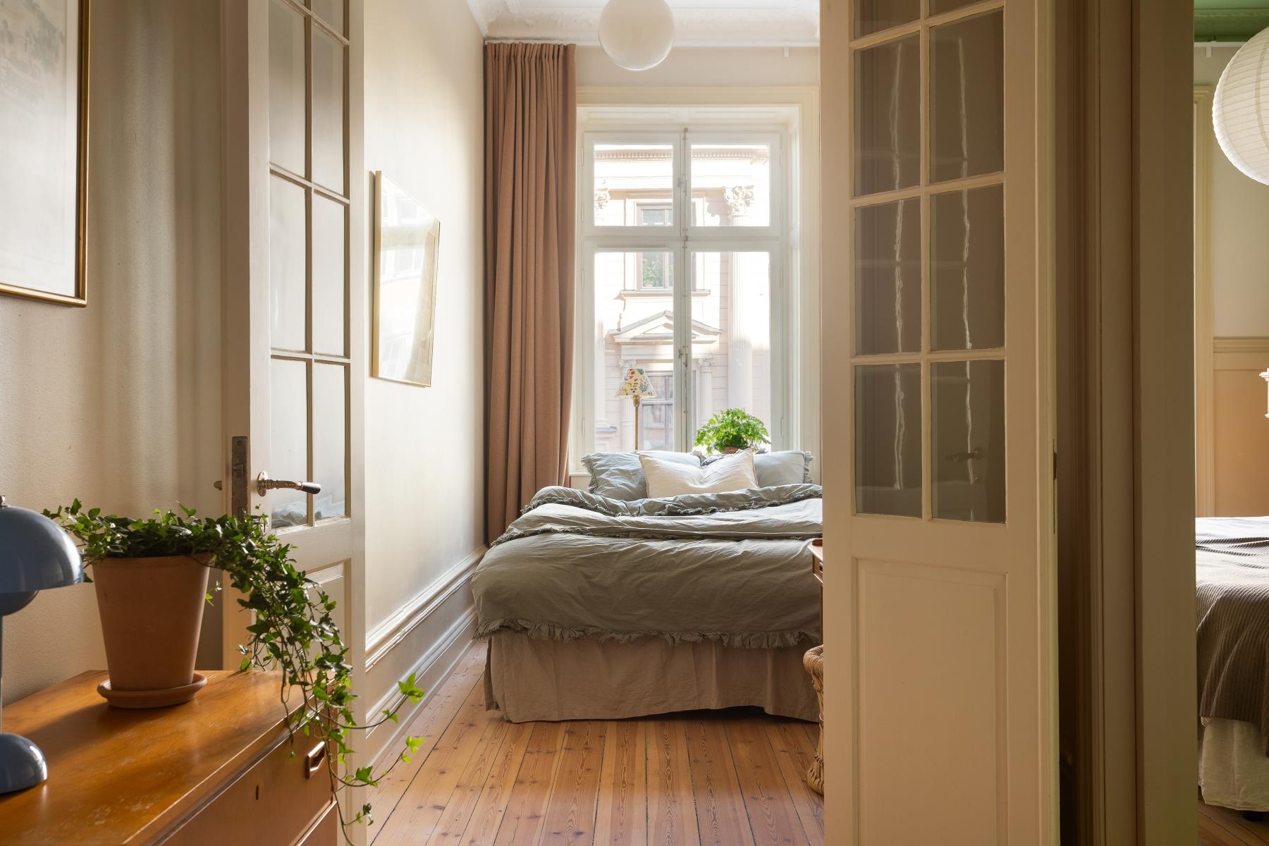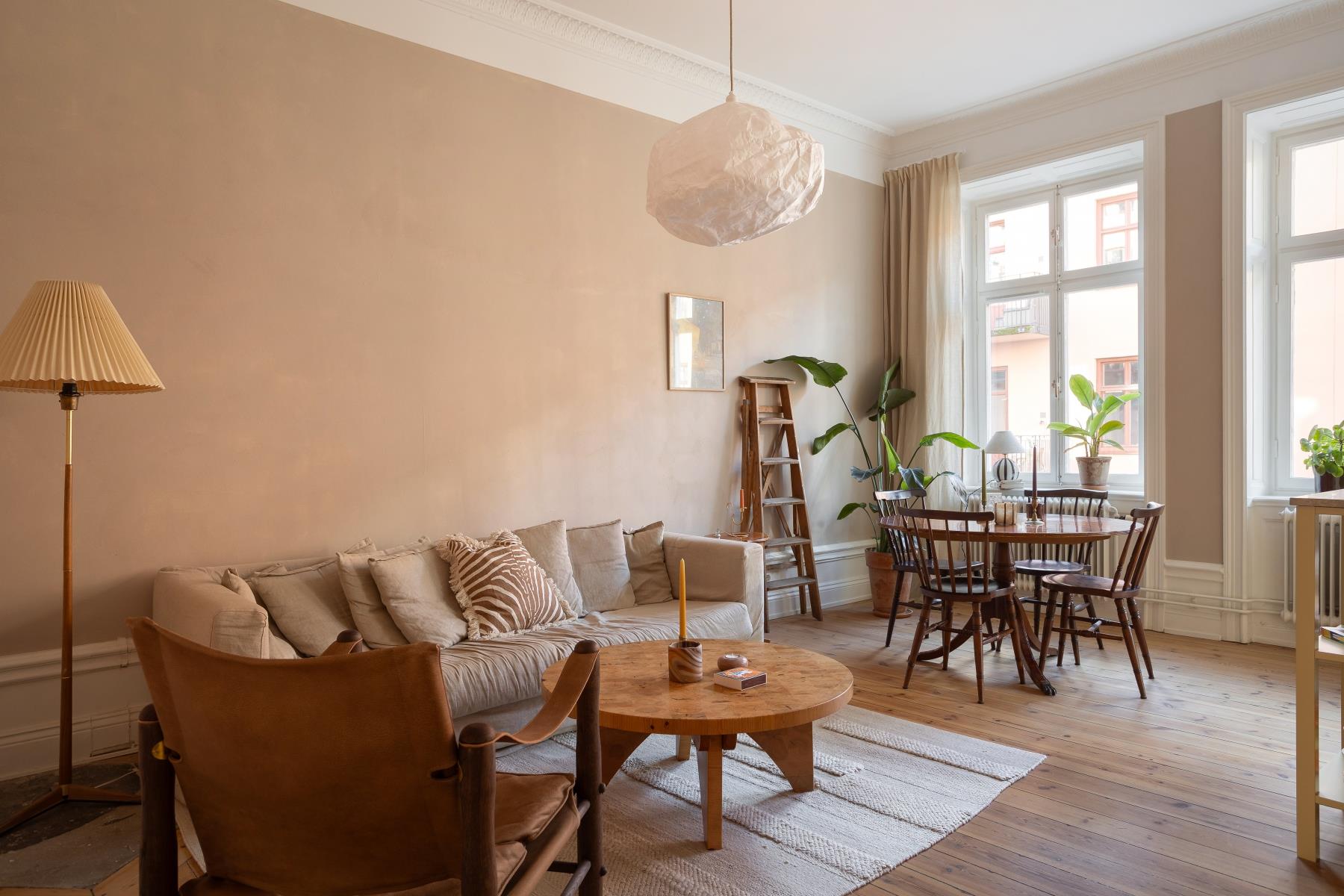 Redan vid första steget in i lägenheten möts du av en varm, inbjudande atmosfär. De generösa fönsterpartierna och de höga taken med vackra originaldetaljer låter ljuset flöda genom rummen och skapar en känsla av rymd. Här samsas stuckaturer, speglade dörrar och trägolv med en noga utvald färgpalett i mjuka toner.