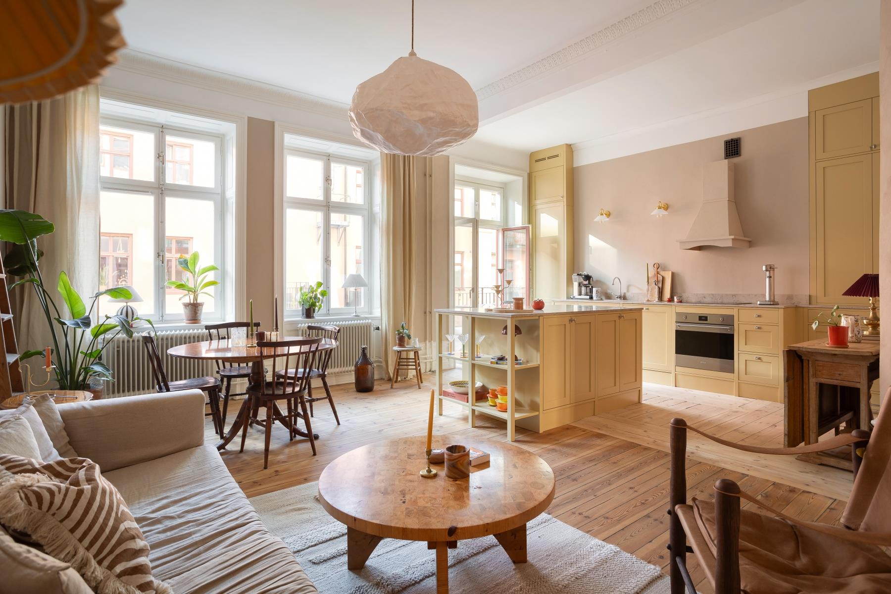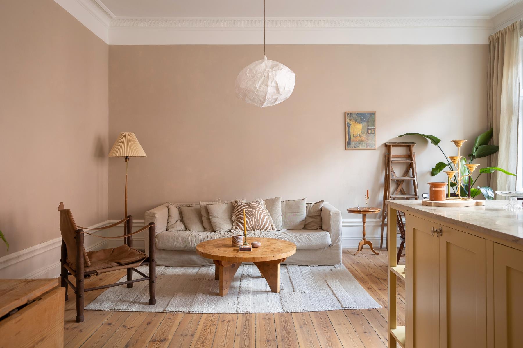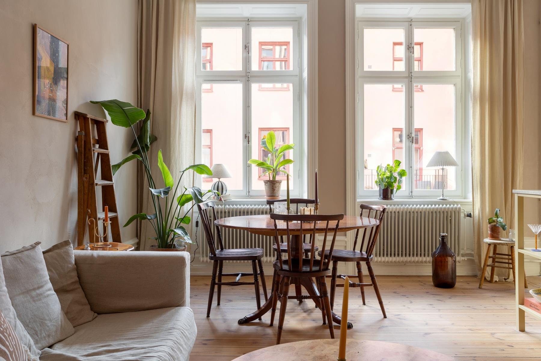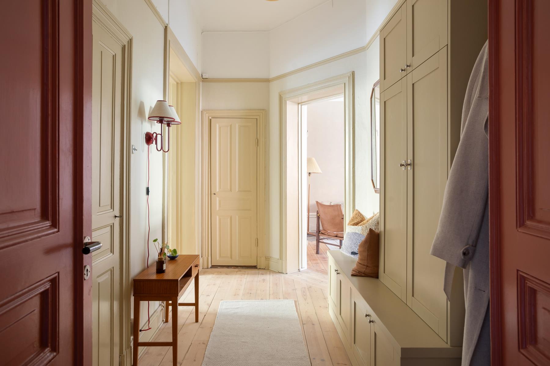 Redan vid första steget in i lägenheten möts du av en varm, inbjudande atmosfär. De generösa fönsterpartierna och de höga taken med vackra originaldetaljer låter ljuset flöda genom rummen och skapar en känsla av rymd. Här samsas stuckaturer, speglade dörrar och trägolv med en noga utvald färgpalett i mjuka toner.