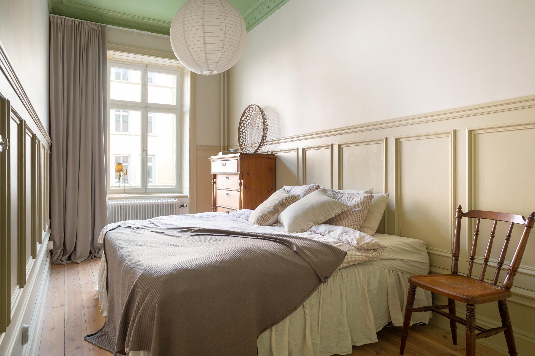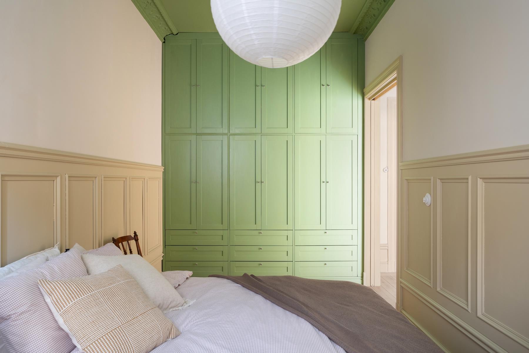 De två sovrummen erbjuder lugn och rofylld karaktär, varav det ena har platsbyggd garderobsvägg målad i en vacker grön kulör.