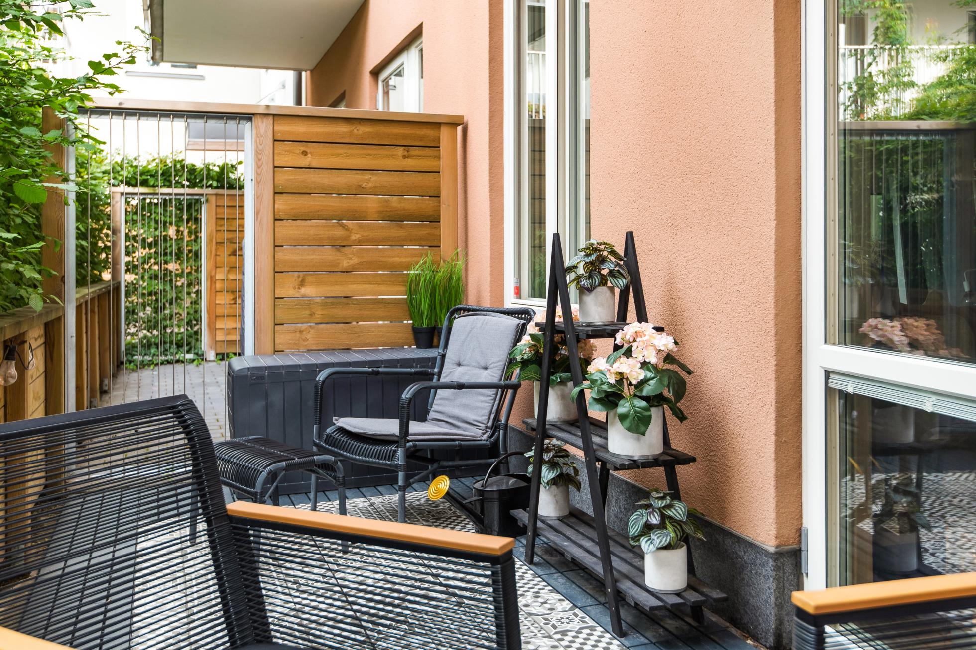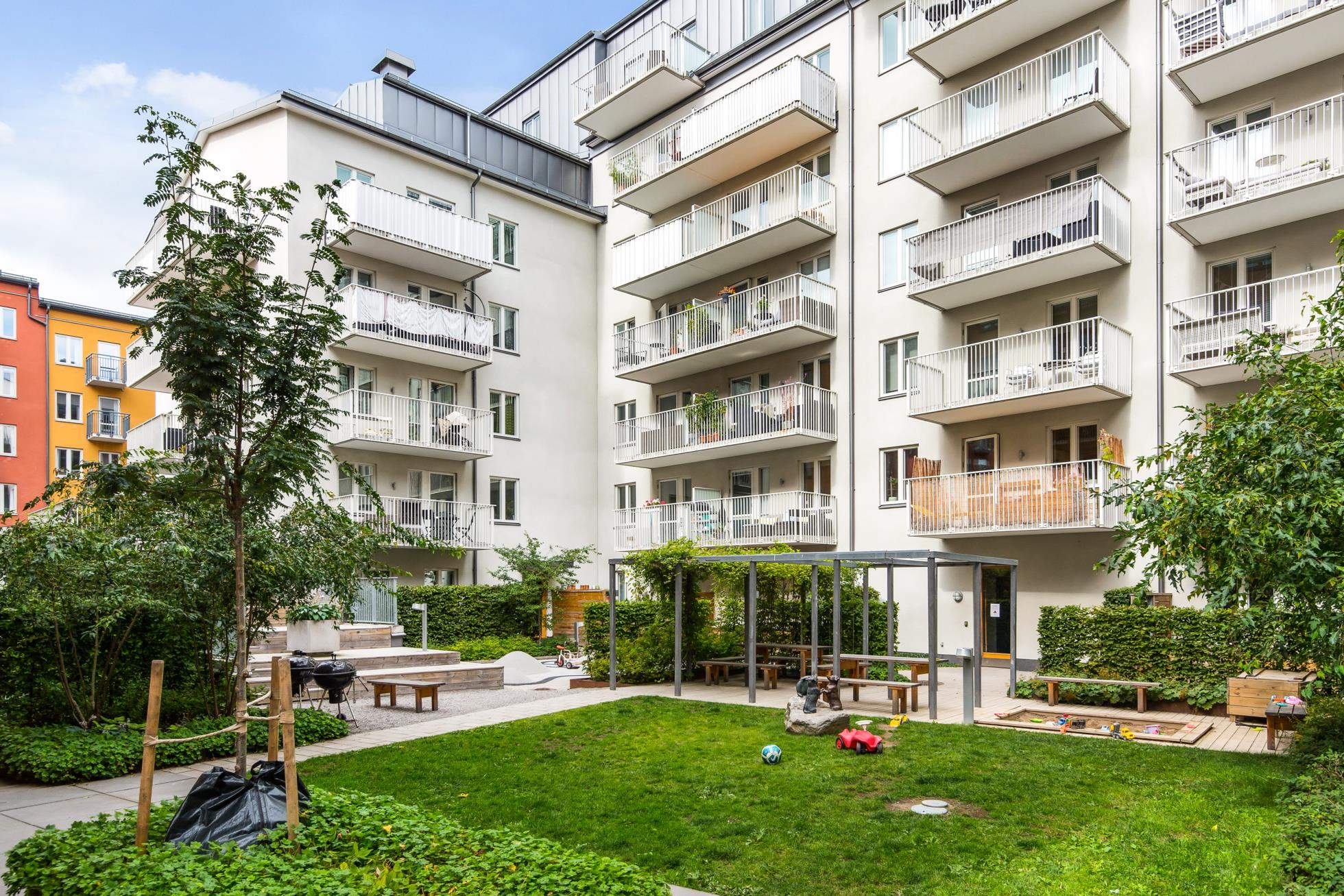 Till föreningen hör även en innergård med gemensam uteplats, lekyta och cykelparkering.