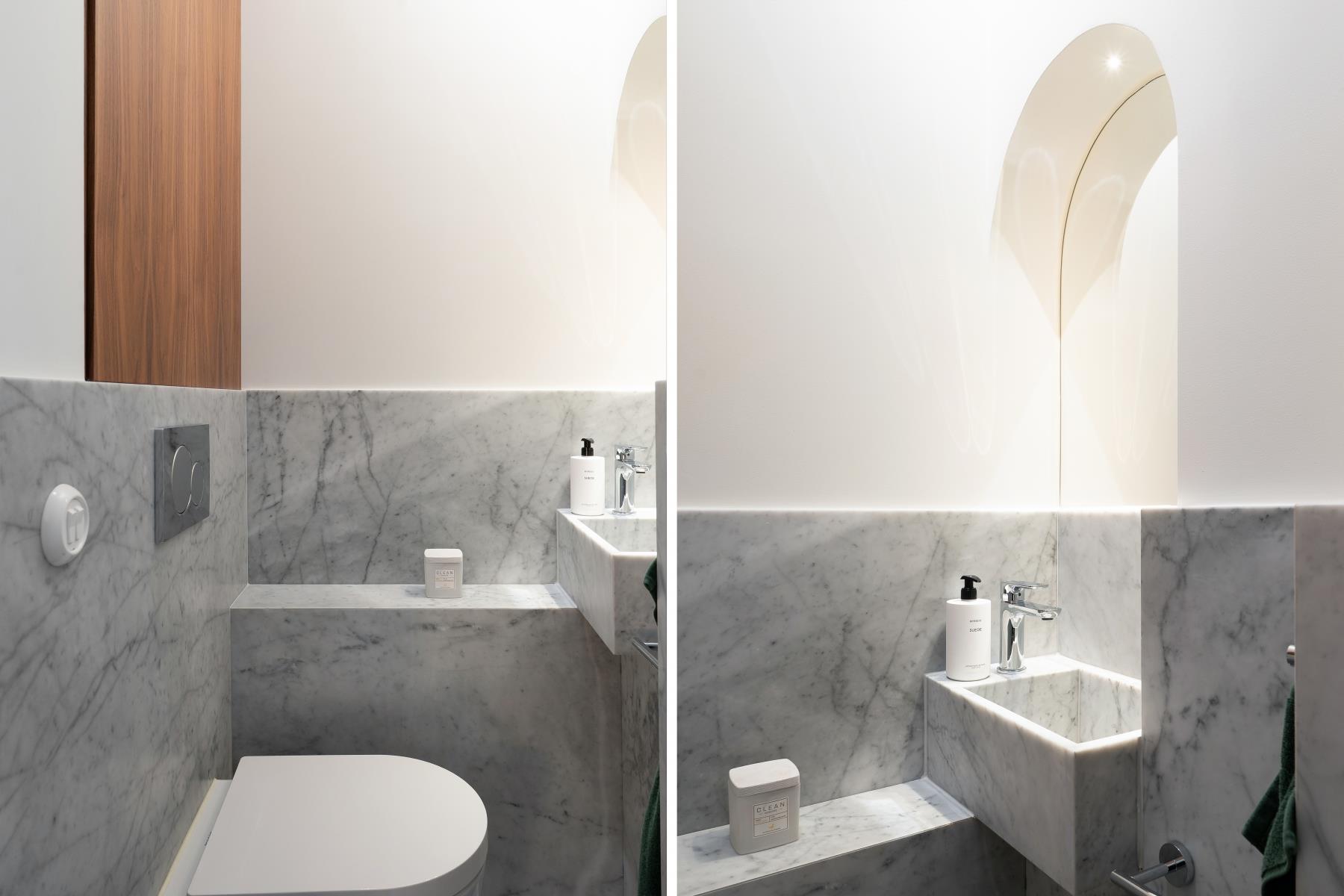 Badrummet är helkaklat med dusch och tvättpelare, och därtill finns en separat gäst-wc klädd i marmor.