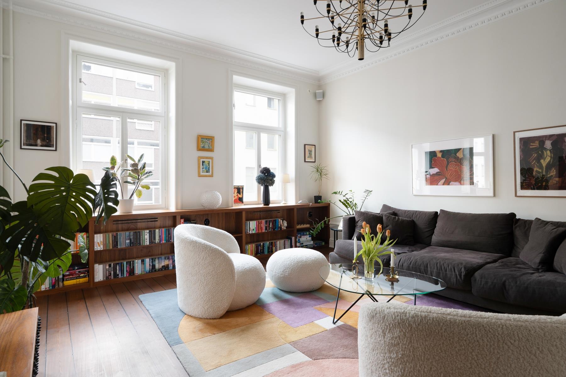 Lägenheten är smakfullt renoverad med hjälp av arkitekt. Det stora köket rymmer enkelt både matlagning och middagar i gott sällskap. Vardagsrummet är luftigt och trivsamt med platsbyggda detaljer.