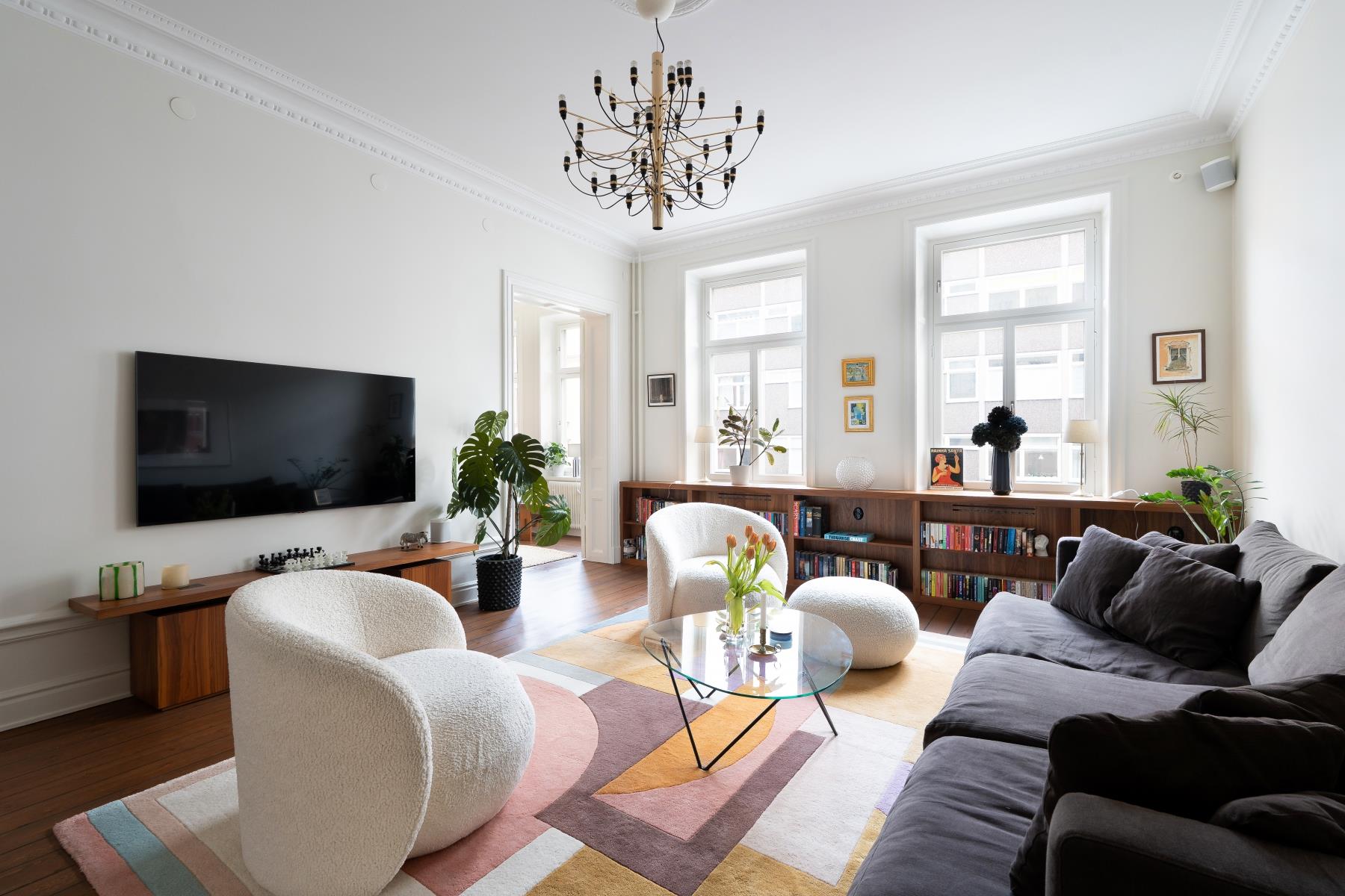 Högt i tak, burspråk, djupa fönsternischer, fina trägolv, stuckaturer och takrosetter skapar en varm och inbjudande känsla.